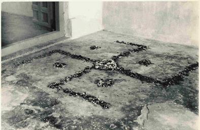 | Keywords: "The spot in Porbander where Mahatama Gandhi was born." In Hinduism, the swastika represents the four directions. Facing right it represents the evolution of the universe; facing left it represents the involution of the universe. Hindus consider the swastika both holy and auspicious and use it to decorate cultural items. Source: UH Manoa Library "The spot in Porbander where Mahatama Gandhi was born." In Hinduism, the swastika represents the four directions. Facing right it represents the evolution of the universe; facing left it represents the involution of the universe. Hindus consider the swastika both holy and auspicious and use it to decorate cultural items. Source: UH Manoa Library |