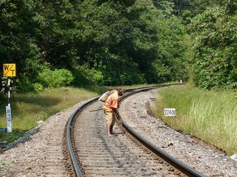 Keywords: Gangman at work.jpg A railway gangman fixing loose clips holding rails to sleepers Castle Rock line Uttara Kanara India own 2012-11-13 Shyamal Rail transport staff Rail track construction and maintenance in India Cc-zero