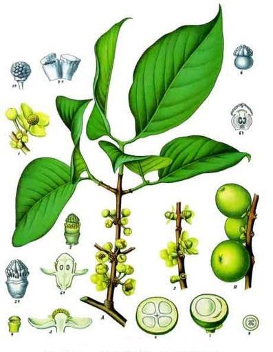 | Keywords: Garcinia morella - Köhler–s Medizinal-Pflanzen-063.jpg  Garcinia A Blüthenzweig der männlichen Pflanze natürl Grösse; B Fruchtzweig desgl ; 1 Zweigstück mit männlichen Blüthen vergrössert; 1<sup>a</sup> Staubgefässköpfchen nach Hanbury desgl ; 2 Zweigstück mit weiblichen Blüthen desgl ; 3 männliche Blüthe im Längsschnitt desgl ; 4 geöffnetes Staubgefäss desgl ; 4<sup>a</sup> 2 Staubgefässe geöffnet und ungeöffnet nach Bâillon; 5 Fruchtknoten mit Staminodienkranz desgl ; 5<sup>a</sup> dieselbe Figur nach Hanbury; 6 Fruchtknoten mit Narbe desgl nach Hanbury; 6<sup>a</sup> weibliche Blüthe im Längsschnitt desgl ; 6<sup>b</sup> Fruchtknoten im Längsschnitt desgl nach Hanbury; 7 Fruchtquerschnitt mit nur einem fruchtbaren Fache natürl Grösse; 8 derselbe mit 4 fruchtbaren Fächern desgl ; 9 Querschnitt durch den Fruchtknoten vergrössert Garcinia morella Га циния мо елла A  цветущая ветвь мужского  астения; B  плодущая ветвь; 1  часть ветви с мужскими цветками; 1<sup>a</sup>  синанд ий по Хэнбе и; 2  часть ветви с женскими цветками; 3  мужской цветок в п одольном  аз езе; 4   аск ывшаяся тычинка; 4<sup>a</sup>  2 тычинки  аск ывшаяся и не аск ывшаяся по Байону; 5  завязь со с осшимися стаминодиями по Байону; 5<sup>a</sup>  то же по Хэнбе и; 6  завязь с  ыльцем по Хэнбе и; 6<sup>a</sup>  женский цветок в п одольном  аз езе; 6<sup>b</sup>  завязь в п одольном  аз езе по Хэнбе и; 7  попе ечный с ез плода с одним сегментом; 8  то же для плода с 4 сегментами; 9  завязь в попе ечном  аз езе 1897 http //pharm1 pharmazie uni-greifswald de/allgemei/koehler/koeh-eng htm List of Koehler Images Franz Eugen Köhler Köhler's Medizinal-Pflanzen PD-old Köhler's Medizinal-Pflanzen Garcinia morella |
