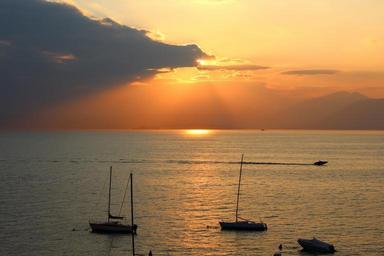 Keywords: garda sunset clouds sun sailing boats powerboat abendstimmung water mood romance mirroring lake dusk lichtspiel sky