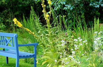Keywords: garden bench garden pond plant oasis rest relaxation wild flowers garden meditation still mood relax atmospheric wellness landscape meditative