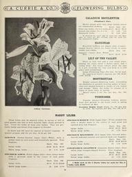 | Keywords: Garden and farm seeds (15817968943).jpg A CURRIE CO W <br> FLOWERING BULBS <br> I ilium Aurntum <br> CALADIUM ESCULENTUM <br> Elephant's Ear <br> Showy plants with very large leaves useful <br> for ornamental bedding Each Doz 100 <br> First size bulbs 1 to 2 inches 0 10 0 75 5 00 <br> Second size bulbs 2 to 3 in 12 1 00 7 00 <br> Mammoth bulbs 20 2 00 12 00 <br> If wanted by mail add 3c each for the first <br> size 5c each for the second and 10c each for <br> the mammoth bulbs <br> GLOXINIAS <br> Beautiful bulbous pot plants with trumpet- <br> shaped flowers which are borne freely in many <br> shades and colors Each Doz 100 <br> Separate Colors Red White <br> Blue 0 10 1 00 7 00 <br> LILY OF THE VALLEY <br> Plant in rich soil and a cool shady place <br> placing the roots about 5 inches apart and 2 <br> inches deep For house culture plant the pips <br> in a pot covering the tops and keep in a cold <br> place until established <br> Large Flowering Pips Per doz 35c by mail <br> By express at buyer's expense per 100 2 00; <br> 1 000 16 00 <br> MONTBRETIAS <br> Bright summer-flowering bulbs resembling <br> the Gladiolus in growth bearing spikes of beau- <br> tiful star-shaped flowers in shades of red yellow <br> and orange Plant the bulbs in clumps of a <br> dozen or more early in spring <br> Mixed colors 3 for 10c; per doz 30c; 100 <br> 2 00 <br> TUBEROSES <br> Popular summer-blooming bulbous plants <br> Start into growth in the house early in spring <br> or outdoors in May <br> Excelsior Double Pearl Each 5c; 50c per doz <br> by mail By express per doz 35c; 100 2 50 <br> HARDY LILIES <br> These Lilies may be planted either in spring or fall in <br> good garden soil that is well drained; light sandy ground is <br> best Cover the bulbs at least nine inches They are per- <br> fectly hardy and blooni from August to October <br> At dozen and 100 rates by express at buyer's expense If <br> wanted prepaid add 25c per doz ; 1 00 per 100 <br> AURATUM Golden-Banded Japan Lily White with a <br> golden band on each petal and beautifully spotted Very <br> fragrant <br> Each Doz 100 <br> Large bulbs 0 20 1 25 8 00 <br> Extra large bulbs 25 1 75 12 00 <br> SPECIOSUM ALBUM White Japan Lily Pure satiny-white <br> with a greenish band in the center of each petal <br> fragrant <br> Each Doz 100 <br> Large bulbs 0 20 1 35 10 00 <br> Extra large bulbs 25 2 00 14 00 <br> SPECIOSUM ROSEUM Pink Japan Lily White shaded rose <br> with a deeper band in the center of each petal and <br> spotted deep red fragrant <br> Each Doz 100 <br> Large bulbs 0 20 1 25 8 00 <br> Extra large bulbs 25 1 75 12 00 <br> SPECIOSUM MELPOMENE Red Japan Lily Ground white <br> heavily suffused carmine and spotted dark red fragrant <br> Each Doz 100 <br> Large bulbs 0 20 1 50 10 00 <br> Extra large bulbs 25 1 75 12 00 <br> LONGIFLORUM GIGANTEUM Japanese Easter Lily Pure <br> white long trumpet-shaped flowers Very fragrant <br> Each Doz 100 <br> Large bulbs 0 15 1 25 9 00 <br> Extra large bulbs 25 1 75 12 00 <br> 1 Bulb each of the 5 Hardy Lilies by mail for 75c; 3 <br> bulbs each 2 00 42156435 132760 65915 Page 71 Text http //www biodiversitylibrary org/page/42156435 1913 10 5962/bhl title 65915 A Currie Company ; Henry G Gilbert Nursery and Seed Trade Catalog Collection NameFound Caladium esculentum NameConfirmed Caladium esculentum L Vent EOLID 1091931 NameBankID 5875357 NameFound Giganteum NameConfirmed Giganteum NameBankID 5328023 Biodiversity Heritage Library Garden and farm seeds spring 1913 um Garden Stories Bulbs Plants Catalogs Equipment and supplies Flowers Gardening Nurseries Horticulture Plants Ornamental Seeds Vegetables U S Department of Agriculture National Agricultural Library bhl page 42156435 dc identifier http //biodiversitylibrary org/page/42156435 bhlGardenStories Lilies A Currie Co BHLinbloom bulbs plants nurseries horticulture plants ornamental u s department of agriculture national agricultural library bhlgardenstories a currie co bhlinbloom Information field Flickr posted date ISOdate 2015-02-03 Check categories 2015 August 25 CC-BY-2 0 BioDivLibrary https //flickr com/photos/61021753 N02/15817968943 2015-08-25 01 56 05 cc-by-2 0 PD-old-70-1923 Garden and farm seeds 1913 Photos uploaded from Flickr by FĂŚ using a script |