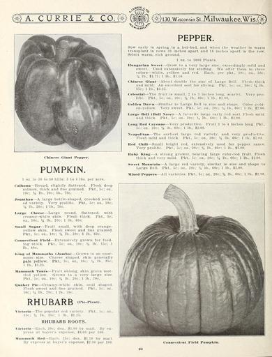 | Keywords: Garden and farm seeds (16185034398).jpg  c yg£j£ <br> A CURRIE CO <br> fl£ J 130 Wisconsin St Milw aukee Wis £ £ <br> PEPPER <br> Chinese Giant Pepper <br> PUMPKIN <br> 1 oz to 30 to 50 hills; 3 to 4 lbs per acre <br> Calhoun ” Round slightly flattened Flesh deep <br> salmon thick and fine grained Pkt 5c; oz <br> 10c; Vi lb 20c; lb 70c <br> Jonathan ” A large bottle-shaped crooked neck- <br> ed variety Very prolific Pkt 5c; oz 10c; <br> Vi lb 20c; 1 lb 70c <br> Large Cheese ” Large round flattened 'with <br> creamy-white skin Flesh thick Pkt 5c; <br> oz 10c; lb 20c; 1 lb 60c <br> Small Sugar ” Fruit small with deep orange- <br> yellow skin Flesh sweet and fine grained <br> Pkt 5c; oz 10c; lb 20c; 1 lb 60c <br> Connecticut Field ” Extensively grown for feed- <br> ing stock Pkt 5c; oz 10c; lb 15c; 1 <br> lb 40c <br> King of Mammoths Jumbo ” Grows to an enor- <br> mous size Cheese shaped skin generally <br> pale yellow Pkt 5c; oz 10c; 14 lb 35c; <br> 1 lb 1 25 <br> Mammoth Tours ” Fruit oblong skin green mot- <br> tled yellow Grows to a very large size <br> Pkt 5c; oz 10c; Vi lb 20c; 1 lb 70c <br> Quaker Pie ” Creamy-white skin oval shaped <br> Flesh sweet and fine grained Pkt 5c; oz <br> 10c; 14 lb 20c; 1 lb 70c <br> RHUBARB c <br> ie-Plaut <br> Pkt 5c; oz <br> Victoria ” The popular red variety <br> 15c; Vi lb 35c; 1 lb 1-25 <br> RHUBARB ROOTS <br> Victoria ” Each 10c; doz 1 00 by mail By ex- <br> press at buyer's expense 6 00 per 100 <br> Mammoth Red ” Each 15c; doz 1 50 by mail <br> By express at buyer's expense 7 50 per 100 <br> Sow early in spring in a hot-bed and when the weather is warm <br> transplant in rows 30 inches apart and 18 inches apart in the row <br> Select warm rich ground <br> 1 oz to 1000 Plants <br> Hungarian Sweet ” Grow to a very large size; exceedingly mild and <br> sweet Used extensively for stuffing We offer them in three <br> colors ” -white yellow and red Each per pkt 10c; oz 50c; <br> lb 1 75; 1 lb 5 50 <br> Chinese Giant ” About double the size of Large Bell Flesh thick <br> and mild An excellent sort for slicing Pkt 5c; oz 30c; lb <br> 85c; 1 lb 3 25 <br> Celestial ” The fruit is small 2 to 3 inches long scarlet Very pro- <br> lific Pkt 5c; oz 20c; lb 60c; 1 lb 2 00 <br> Golden Dawn ” Similar to Large Bell in size and shape Color £old- <br> en-yellow Very sweet Pkt 5c; oz 20c; 14 lb 60c; 1 lb 2 00 <br> Large Bell Bull Nose ” A favorite large early red sort Flesh mild <br> and thick Pkt 5c; oz 20c; lb 60c; 1 lb 2 00 <br> Long Red Cayenne ” Very productive Fruit 3 to 4 inches long Pkt <br> 5c; oz 20c; 14 lb 60c; 1 lb 2 00 <br> Neapolitan ” The earliest large red variety and very productive <br> Flesh mild and thick Pkt 5c; oz 20c; lb 60c; 1 lb 2 00 <br> Red Chili ” Small bright red extensively used for pepper sauce <br> Very prolific Pkt 5c; oz 20c; lb 60c; 1 lb 2 00 <br> Ruby King ” A strong grower bearing large ruby-red fruit Flesh <br> thick and very mild Pkt 5c; oz 20c; lb 60c; 1 lb 2 00 <br> Sweet Mountain ” A large red variety similar in size and shape to <br> Large Bell Pkt 5c; oz 20c; 14 lb 60c; 1 lb 2 00 <br> Mixed Peppers ” All varieties Pkt 5c; oz 20c; lb 60c; 1 lb 2 00 <br> Connecticut Field Pumpkin <br> 24 42156476 132761 65916 Page 24 Text http //www biodiversitylibrary org/page/42156476 1912 10 5962/bhl title 65916 A Currie Company ; Henry G Gilbert Nursery and Seed Trade Catalog Collection Biodiversity Heritage Library Garden and farm seeds spring 1912 Garden Stories Bulbs Plants Catalogs Equipment and supplies Flowers Gardening Nurseries Horticulture Plants Ornamental Seeds Vegetables U S Department of Agriculture National Agricultural Library bhl page 42156476 dc identifier http //biodiversitylibrary org/page/42156476 bhlGardenStories BHLinbloom bulbs plants nurseries horticulture plants ornamental u s department of agriculture national agricultural library bhlgardenstories bhlinbloom Information field Flickr posted date ISOdate 2015-01-26 Check categories 2015 August 25 CC-BY-2 0 BioDivLibrary https //flickr com/photos/61021753 N02/16185034398 2015-08-25 06 52 22 cc-by-2 0 PD-old-70-1923 Garden and farm seeds 1912 Photos uploaded from Flickr by Fæ using a script |