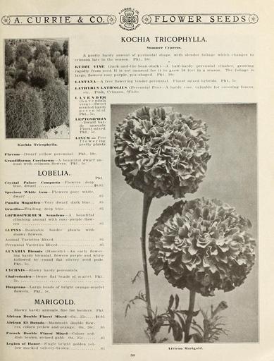 Keywords: Garden and farm seeds (16185096658).jpg A CURRIE COM <br> quautyJ <br> FLOWER SEEDS <br> KOCHIA TRICOPHYLLA <br> Kochin Tricophylla <br> Summer Cypress <br> A pretty hardy annual of pyrimidal shape with slender foliage which changes to <br> crimson late in the season Pkt 10c <br> KUDZU VINE Jack-and-the-bean-stalk ” A half-hardy perennial climber growing <br> rapidly from seed It is not unusual for it to grow 50 feet in a season The foliage is <br> large flowers rosy purple pea-shaped Pkt 10c <br> LANTANA ” A free flowering tender perennial Finest mixed hybrids Pkt 5c <br> LATHYRUS LATIFOLIUS Perennial Pea ” A hardy vino valuable for covering fences <br> etc Pink Crimson White <br> 1 A V E N D ER <br> Lave ndula <br> vera ” Sweet <br> scented hardy <br> p e r e n ni al <br> Pkt 5c <br> LEPTOS1PHON <br> ” Dwarf har- <br> dy annuals <br> Finest mixed <br> Pkt 5c <br> UNUM ” Free <br> flower ing <br> pretty plants <br> Flnviim ” Dwarf yellow perennial Pkt 10c <br> Grandifloriun Coccineum ” A beautiful dwarf an- <br> nual with crimson flowers Pkt 5c <br> LOBELIA <br> Pkt <br> Crystal Palace Compneta ” Flowers deep <br> blue dwarf 0 0 5 <br> Speciosa White Gem ” Flowers pure white <br> dwarf 05 <br> Pumila Magnifica ” Very dwarf dark blue 05 <br> Gracilis ” Trailing deep blue 05 <br> LOPHOSI'ERMI M Seaiuleiis ” A beautiful <br> climbing annual with rosy-purple flow- <br> ers ' 05 <br> LUPINS ” Desirable border plants with <br> showy flowers <br> Annual Varieties Mixed 05 <br> Perennial Varieties Mixed 05 <br> LLNAKIA Biennis Honesty ” An early flower- <br> ing hardy biennial flowers purple and white <br> followed by round flat silvery seed pods <br> Pkt 5c <br> LYCHNIS ” Showy hardy perennials <br> Clinleedonica ” Dense flat heads of scarlet Pkt <br> 5c <br> Hnagcaua ” Large heads of bright orange-scarlet <br> flowers Pkt 5c <br> MARIGOLD <br> Showy hardy annuals fine for borders Pkt <br> Afriean Double Finest Mixed ” Oz ž 25c 0 05 <br> African EI Dorado ” Mammoth double flow- <br> ers colors yellow and orange Oz j0c 05 <br> French Double Finest Mixed ” Colors red- <br> dish brown striped gold Oz 25c 05 <br> Lesion of Honor ” S'ngle bright golden yel- <br> low marked velvety-brown 05 <br> African Marigold <br> - 42156511 132761 65916 Page 59 Text http //www biodiversitylibrary org/page/42156511 1912 10 5962/bhl title 65916 A Currie Company ; Henry G Gilbert Nursery and Seed Trade Catalog Collection NameFound Coccineum NameFound Gracilis NameConfirmed Gracilis NameBankID 5085375 NameFound Kochia NameConfirmed Kochia Roth EOLID 61798 NameFound Lantana NameConfirmed Lantana L EOLID 37682 NameBankID 459108 NameFound Lathyrus latifolius NameConfirmed Lathyrus latifolius EOLID 703172 NameBankID 2650621 NameFound Lobelia NameConfirmed Lobelia sect Rhynchopetalum Fresenius Benth EOLID 2895791 NameFound Lupins NameFound Lychnis NameConfirmed Lychnis EOLID 61751 NameBankID 2646590 NameFound Pumila NameConfirmed Pumila EOLID 10655727 NameBankID 5331131 NameFound Speciosa NameConfirmed Speciosa NameBankID 5330982 Biodiversity Heritage Library Garden and farm seeds spring 1912 Garden Stories Bulbs Plants Catalogs Equipment and supplies Flowers Gardening Nurseries Horticulture Plants Ornamental Seeds Vegetables U S Department of Agriculture National Agricultural Library bhl page 42156511 dc identifier http //biodiversitylibrary org/page/42156511 bhlGardenStories BHLinbloom bulbs plants nurseries horticulture plants ornamental u s department of agriculture national agricultural library bhlgardenstories bhlinbloom Information field Flickr posted date ISOdate 2015-01-26 Check categories 2015 August 25 CC-BY-2 0 BioDivLibrary https //flickr com/photos/61021753 N02/16185096658 2015-08-25 06 55 32 cc-by-2 0 PD-old-70-1923 Garden and farm seeds 1912 Photos uploaded from Flickr by FĂŚ using a script
