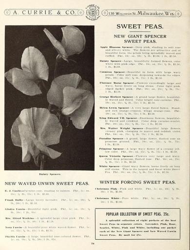 | Keywords: Garden and farm seeds (16185120708).jpg  f A C U R R I E CO g mm 130 Wiscons n suM ilwaukee WisTS <br> v®' ” - <br> SWEET PEAS <br> ' ˘ ˘AUHtf <br> Dainty Spencer <br> NEW WAVED UNWIN SWEET PEAS <br> E 1 Castle ” Carmine-rose shading to salmon Pkt 5c; oz <br> 15c; Yi lb 35c; 1 lb 1 00 <br> Frank Dolby ” Large lovely lavender Pkt 5c; oz 20c; Y± <br> lb ž 50c; 1 lb 1 50 <br> Gladys Unirin ” Beautiful light pink Pkt 5c; oz 10c; <br> lb 30c; 1 lb 85c <br> Sirs Alfred Walkins ” A splendid large clear pink Pkt 5c <br> oz 15c; Yi lb 40c; 1 lb 1 20 <br> Nora 1 nwin ” A beautiful pure white waved flower Pkt ; <br> oz 15c; V-t lb 45c; 1 lb 1 35 <br> Phyllis Vnnin ” A large beautiful rose-colored flower Pkt <br> 5c; oz 10c; Vi lb 30c; 1 lb 85c <br> NEW GIANT SPENCER <br> SWEET PEAS <br> Apple Blossom Spencer ” Deep pink shading to soft rose <br> and silvery white The flowers are attractive and of <br> beautiful form the petals being splendidly waved and <br> ruffled Pkt 10c; oz 30c; Yt lb 1 00; 1 lb 3 50 <br> Dainty Spencer ” Large beautifully formed flowers color <br> white with pink edge Pkt 10c; oz 35c; lb 1 10; <br> 1 lb 4 00 <br> Countess Speneer ” Beautiful in form with large wavy <br> petals Color soft rose deepening towards the edges <br> Pkt 10c; oz 25c; Yi lb 75c; 1 lb 2 50 <br> Florence Morse Spencer ” Flowers exceedingly large and <br> wavy borne freely on long stems Color light pink <br> edged darker pink Pkt 10c; oz 25c; lb 75c; <br> 1 lb 2 50 <br> George Herbert Spencer ” A grand large flower beautiful- <br> ly waved and fluted Color bright rose-carmine Pkt <br> 10c; oz 25c; lb 75c; 1 lb 2 50 <br> Helen Lew is Speneer ” A very large fluted flower Stand- <br> ard rich orange-crimson wings orange-rose Pkt <br> 10c; oz 25c; lb 75c; 1 lb 2 50 <br> King Edward VII Spencer ” Enormous flowers beautiful- <br> ly -waved and crinkled Color deep carmine-scarlet <br> Pkt 10c; oz 25c; lb 75c; 1 lb 2 50 <br> Mrs Walter Wright Spencer ” Beautiful large flowers <br> creamy pink changing to mauve and reddish violet <br> Pkt 10c; oz 25c; lb 75c; 1 lb 2 50 <br> Paradise Spencer ” A grand large flower flushed rose on <br> primrose ground Pkt 10c; oz 25c; Y\ lb 75c; <br> 1 lb 2 50 <br> Primrose Speneer ” A large wavy flower of a creamy yel- <br> low color Pkt 10c; oz 25c; lb 75c; 1 lb 2 50 <br> Queen Victoria Spencer ” Flowers very large and wavy <br> Color deep primrose flushed rose Pkt 10c; oz 25c; <br> lb 75c; 1 lb 2 50 <br> Wliite Spencer ” Giant wavy flowers borne freely on long <br> stiff stems This is the largest and finest white Sweet <br> Pea Pkt 10c; oz 25c; lb ž 75c; 1 lb ž 2 50 <br> WINTER FORCING SWEET PEAS <br> Christinas Pink ” Pink and white Pkt 5c; oz 10c; lb <br> 30c; 1 lb 1 00 <br> Christmas White ” Pure white Pkt 5c; oz 10c; Yi lb <br> 30c; 1 lb 1 00 <br> POPULAR COLLECTION OF SWEET PEAS 25c <br> A splendid collection of eight packets of the best <br> Sweet Peas in separate colors Lavender Pink Rose <br> Scarlet Wliite Pink and White including one packet <br> each of the New Giant Spencer and Xew Waved I'nwin <br> Sweet Peas By mail for 2 c 42156522 132761 65916 Page 70 Text http //www biodiversitylibrary org/page/42156522 1912 10 5962/bhl title 65916 A Currie Company ; Henry G Gilbert Nursery and Seed Trade Catalog Collection Biodiversity Heritage Library Garden and farm seeds spring 1912 Garden Stories Bulbs Plants Catalogs Equipment and supplies Flowers Gardening Nurseries Horticulture Plants Ornamental Seeds Vegetables U S Department of Agriculture National Agricultural Library bhl page 42156522 dc identifier http //biodiversitylibrary org/page/42156522 bhlGardenStories BHLinbloom bulbs plants nurseries horticulture plants ornamental u s department of agriculture national agricultural library bhlgardenstories bhlinbloom Information field Flickr posted date ISOdate 2015-01-26 Check categories 2015 August 25 CC-BY-2 0 BioDivLibrary https //flickr com/photos/61021753 N02/16185120708 2015-08-25 06 53 26 cc-by-2 0 PD-old-70-1923 Garden and farm seeds 1912 Photos uploaded from Flickr by Fæ using a script |