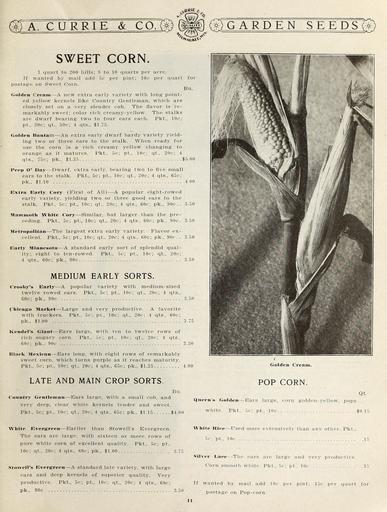 | Keywords: Garden and farm seeds (16370925481).jpg A C URRIE COli BBS <br> GARDEN SEEDS S <br> SWEET CORN <br> 1 quart to 200 hills; S to 10 quarts per acre <br> If wanted by mail add 5c per pint; 10c per quart for <br> postage on Sweet Corn <br> Bu <br> Golden Cream A new extra early variety with long; point- <br> ed yellow kernels like Country Gentleman which are <br> closely set on a very slender cob The flavor is re- <br> markably sweet; color rich creamy-yellow The stalks <br> are dwarf bearing- two to four ears each Pkt 10c; <br> pt 30c; qt 50e; 4 qts 1 75 <br> Golden Ilantam An extra early dwarf hardy variety yield- <br> ing- two or three ears to the stalk When ready for <br> use the corn is a rich creamy yellow changing to <br> orange as it matures Pkt 5c; pt 10c; qt 20c; 4 <br> qts 75c; pk 1 35 5 00 <br> Peep O' Day Dwarf extra early bearing- two to five small <br> ears to the stalk Pkt 5c; pt 10c; qt 20c; 4 qts 65c; <br> pk 1 10 4 00 <br> Extra Early Cory First of All A popular eight-rowed <br> early variety yielding two or three good ears to the <br> stalk Pkt 5c; pt 10c; qt 20c; 4 qts 60c; pk 90c 3 50 <br> Mammoth White Cory Similar but larger than the pre- <br> ceding Pkt 5c; pt 10c; qt 20c; 4 qts 60c; pk 90c 3 50 <br> Metropolitan The largest extra early variety Flavor ex- <br> cellent Pkt 5c; pt 10c; qt 20c; 4 qts 60c; pk 90c 3 50 <br> Early Minnesota A standard early sort of splendid qual- <br> ity; eight to ten-rowed Pkt 5c; pt 10c; qt 20c; <br> 4 qts 60c; pk 90c 3 50 <br> MEDIUM EARLY SORTS <br> Crosby's Early A popular variety with medium-sized <br> twelve rowed ears Pkt 5c; pt 10c; qt 20c; 4 qts <br> 00c; pk 90c 3 50 <br> Chicago Market Large and very productive A favorite <br> with truckers Pkt 5c; pt 10c; qt 20c; 4 qts 60c; <br> pk 1 00 3 75 <br> Kendel's Giant Ears large with ten to twelve rows of <br> rich sugary corn Pkt 5c; pt 10c; qt 20c; 4 qts <br> 60c; pk 90c 3 50 <br> Hack Mexican Ears long with eight rows of remarkably <br> sweet corn which turns purple as it reaches maturity <br> Pkt 5c; pt 10c; qt 20c; 4 qts 65c; pk 1 25 4 00 <br> Golden Creain <br> LATE AND MAIN CROP SORTS <br> Bu <br> Country Gentleman Ears large with a small cob and <br> very deep clear white kernels tender and sweet <br> Pkt 5c; pt 10c; qt 20c; 4 qts 65c; pk 1 15 4 00 <br> POP CORN <br> Qt <br> Queen's Golden Ears large corn golden-yellow pops <br> white Pkt 5c; pt 10c 0 1 <br> White Evergreen Earlier than Stowell's Evergreen <br> The ears are large with sixteen or more rows of <br> pure white corn of excellent quality Pkt 5c; pt <br> 10c; qt 20c; 4 qts 60c; pk 1 00 3 <br> Stowell's Evergreen A standard late variety with large <br> ears and deep kernels of superior quality Very <br> productive Pkt 5c; pt 10c; qt 20c; 4 qts 60c; <br> pk 90c 3 50 <br> White Rice Used more extensively than any other Pkt <br> 5c; pt 10c 15 <br> Silver l aee--The ears are large and very productive <br> Corn smooth white Pkt 5c; pt 10c 15 <br> If wanted by mail add 10c per pint; 15c per quart for <br> postage on Pop-corn <br> 11 42156463 132761 65916 Page 11 Text http //www biodiversitylibrary org/page/42156463 1912 10 5962/bhl title 65916 A Currie Company ; Henry G Gilbert Nursery and Seed Trade Catalog Collection Biodiversity Heritage Library Garden and farm seeds spring 1912 Garden Stories Bulbs Plants Catalogs Equipment and supplies Flowers Gardening Nurseries Horticulture Plants Ornamental Seeds Vegetables U S Department of Agriculture National Agricultural Library bhl page 42156463 dc identifier http //biodiversitylibrary org/page/42156463 bhlGardenStories BHLinbloom bulbs plants nurseries horticulture plants ornamental u s department of agriculture national agricultural library bhlgardenstories bhlinbloom Information field Flickr posted date ISOdate 2015-01-26 Check categories 2015 August 25 CC-BY-2 0 BioDivLibrary https //flickr com/photos/61021753 N02/16370925481 2015-08-25 06 50 23 cc-by-2 0 PD-old-70-1923 Garden and farm seeds 1912 Photos uploaded from Flickr by FĂŚ using a script |