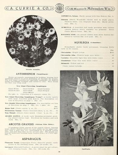 | Keywords: Garden and farm seeds (16370989431).jpg see List <br> of Novelties on page 2 Pkt 25c; 2 pkts 40c <br> Pkt <br> Ma jus Tall Choice mixed oz 15c 0 05 <br> Fietiiratiim Nanum Choice blotched colors oz 20c 05 <br> Tom Thumb Dwarf choice mixed 1 foot oz 25c 05 <br> ARABIS ALPINA A hardy early blooming perennial grow- <br> ing about 6 inches high Excellent for borders and rock <br> work Pkt 5c <br> ARCOTIS GRANDIS African Lilac Daisy <br> A handsome hardy annual of the easiest culture bearing <br> large showy flowers which are pure white on the upper sur- <br> face with a pale blue eye surrounded by a narrow yellow <br> zone and pale lilac-blue on the reverse side The plants are <br> heavily branched forming large bushes from 2 to 3 feet high <br> Pkt 5c <br> ASPARAGUS <br> T'lumosus Nanus Asparagus Fern Graceful plants easily <br> grown in the dwelling house Pkt 10 seeds 10c <br> Sprengeri Emerald Feather A pretty plant for pot culture <br> with drooping fronds Pkt 10c 100 seeds 40c <br> ASPERUr A Setosa Hardy annual with blue flowers Pkt 5c <br> Odorata Sweet Woodruff Grows well in shady places <br> Flowers white very fragrant when dry Hardy peren- <br> nial Pkt 5c <br> AURICULA A beautiful half hardy perennial with various <br> colored flowers which resemble the primrose Extra <br> Choice Mixed Colors Pkt 10c <br> BALLOON VINE An annual climber with white flowers fol- <br> lowed by balloon-like seed pods Pkt 5c <br> AQUILEGIA Columbine <br> Remarkably showy hardy perennials blooming freely <br> early in the season <br> Pkt <br> Chrysantha Bright yellow 0 05 <br> Chrysantha Alba Flowers large pure white 05 <br> Coerulea Beautiful light blue with white center 05 <br> Glanriulosa Clear blue with white center 05 <br> Skinnerii Yellow and red 05 <br> Choice mixed hybrids 05 <br> Aqullegia <br> 4S 42156500 132761 65916 Page 48 Text http //www biodiversitylibrary org/page/42156500 1912 10 5962/bhl title 65916 A Currie Company ; Henry G Gilbert Nursery and Seed Trade Catalog Collection NameFound Aquilegia NameConfirmed Aquilegia EOLID 11205314 NameBankID 2645540 NameFound Aqullegia NameFound Arabis alpina NameConfirmed Arabis alpina EOLID 584157 NameBankID 2648388 NameFound Asparagus NameConfirmed Asparagus var pygmaeus Makino EOLID 10487111 NameFound Auricula NameConfirmed Auricula EOLID 15518830 NameBankID 241260 NameFound Glanriulosa NameFound Lilac NameConfirmed Lilac P Miller 1754 NameFound Nanum NameConfirmed Nanum NameBankID 5331422 NameFound Nanus NameConfirmed Nanus EOLID 73713 NameBankID 2610066 NameFound Setosa NameConfirmed Setosa EOLID 106889 NameBankID 3485568 Biodiversity Heritage Library Garden and farm seeds spring 1912 Garden Stories Bulbs Plants Catalogs Equipment and supplies Flowers Gardening Nurseries Horticulture Plants Ornamental Seeds Vegetables U S Department of Agriculture National Agricultural Library bhl page 42156500 dc identifier http //biodiversitylibrary org/page/42156500 bhlGardenStories BHLinbloom bulbs plants nurseries horticulture plants ornamental u s department of agriculture national agricultural library bhlgardenstories bhlinbloom Information field Flickr posted date ISOdate 2015-01-26 Check categories 2015 August 25 CC-BY-2 0 BioDivLibrary https //flickr com/photos/61021753 N02/16370989431 2015-08-25 06 51 35 cc-by-2 0 PD-old-70-1923 Garden and farm seeds 1912 Photos uploaded from Flickr by FĂŚ using a script |