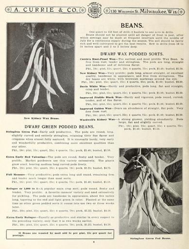 | Keywords: Garden and farm seeds (16371750632).jpg A CURRIE CO <br> RIE <br> 130 Wisconsin si Milwaukee Wis l <br> BEANS <br> New Kidney Wax Beans <br> DWARF GREEN PODDED BEANS <br> One quart to 150 feet of drill; 2 bushels to one acre in drills <br> Beans should not be planted until all danger of frost is past after <br> which sowings may be made at frequent intervals until the middle of <br> July for a continuous supply during the season The soil should be fairly <br> rich and well cultivated to get the best results Sow in drills from 18 to <br> 24 inches apart and 2 to 3 inches deep <br> DWARF WAX PODDED SORTS <br> Currie's Rust-Proof Wax The earliest and most prolific Wax Bean Is <br> free from rust tender and stringless The pods are long straight <br> and handsome and of delicious flavor <br> Pkt 10c; pint 15c; quart 25c; 4 quarts 75c; peck 1 40; bushel 5 50 <br> New Kidney Wax Very prolific; pods long almost straight of excellent <br> quality handsome in appearance and free from stringiness The <br> dry beans are white with brownish markings around the eye <br> Pkt 10c; pint 15c; quart 25c; 4 quarts 85c; peck 1 60; bushel 6 00 <br> Davis White Wax- Hardy and productive pods long flat and straight <br> crisp and tender <br> Pkt 10c; pint 15c; quart 25c; 4 quarts 75c; peck 1 40; bushel 5 50 <br> Improved Prolific Black Wax Hardy and vigorous pods round curved <br> tender and of fine flavor <br> Pkt 10c; pint 15c; quart 25c; 4 quarts 75c; peck 1 40; bushel 5 50 <br> Improved Golden Wax Bears an abundance of straight flat pods Very <br> free from rust <br> Pkt 10c; pint 15c; quart 25c; 4 quarts 75c; peck 1 40; bushel 5 50 <br> Wardwell's Kidney Wax A strong grower yielding abundantly Pods <br> large flat and slightly curved <br> Pkt 10c; pint 15c; quart 25c; 4 quarts 75c; <br> peck 1 40; bushel 5 50 <br> Stringless Green Pod- Early and productive The pods are round long <br> slightly curved and entirely stringless retaining their fine flavor and <br> crispness when almost fully matured It is unusually hardy very early <br> and wonderfully productive combining more excellent qualities than <br> any other <br> Pkt 10c; pint 15c; quart 25c; 4 quarts 75c; peck 1 40; bushel 5 50 <br> Extra Early Red Valentine The pods are round fleshy and tender Very <br> prolific Market gardeners use this variety extensively The plants <br> grow erect bearing medium long curved pods freely <br> Pkt 10c; pint 15c; quart 25c; 4 quarts 70c; peck 1 25; bushel 4 75 <br> Full Measure Very productive; pods extra long and round remaining firm <br> and tender much longer than most sorts <br> Pkt 10c; pint 15c; quart 25c; 4 quarts 75c; peck 1 40; bushel 5 50 <br> Refugee or 1 000 to 1 A popular main crop sort; pods round fleshy and <br> tender Very prolific A favorite canners' variety and used extensively <br> for pickling The pods are handsome in appearance about five inches <br> long tapering to the end and light green in color Planted at the same <br> time as other green podded sorts it comes into use two or three weeks <br> later <br> Pkt 10c; pint 15c; quart 25c; 4 quarts 70c; peck 1 25; bushel 4 50 <br> Extra Early Refugee Equally as productive and similar in every respect to <br> the preceding variety only that it is two weeks earlier <br> Pkt 10c; pint 15c; quart 25c; 4 quarts 70c; peck 1 25; bushel 4 50 <br> If Beans are wanted by mail add 8c per pint 15c per quart for <br> postage i ' <br> Stringless Green Pod Beans 42156456 132761 65916 Page 4 Text http //www biodiversitylibrary org/page/42156456 1912 10 5962/bhl title 65916 A Currie Company ; Henry G Gilbert Nursery and Seed Trade Catalog Collection Biodiversity Heritage Library Garden and farm seeds spring 1912 Garden Stories Bulbs Plants Catalogs Equipment and supplies Flowers Gardening Nurseries Horticulture Plants Ornamental Seeds Vegetables U S Department of Agriculture National Agricultural Library bhl page 42156456 dc identifier http //biodiversitylibrary org/page/42156456 bhlGardenStories BHLinbloom bulbs plants nurseries horticulture plants ornamental u s department of agriculture national agricultural library bhlgardenstories bhlinbloom Information field Flickr posted date ISOdate 2015-01-26 Check categories 2015 August 25 CC-BY-2 0 BioDivLibrary https //flickr com/photos/61021753 N02/16371750632 2015-08-25 06 54 56 cc-by-2 0 PD-old-70-1923 Garden and farm seeds 1912 Photos uploaded from Flickr by FĂŚ using a script |