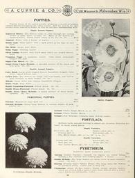 Keywords: Garden and farm seeds (16372754915).jpg A CURRIE COl <br> 130 Wisconsin St Mil waukee Wis l <br> POPPIES <br> Popular plants of the easiest growth producing a wealth of brilliant <br> colored flowers throughout the entire season Sow the seed in the open <br> ground where wanted to flower as they do not bear transplanting well <br> Single Annual Poppies <br> Pkt <br> Improved Shirley ” The flowers range in color through the various <br> shades of pink white carmine etc Many of the flowers are <br> bordered white Finest mixed colors oz 15c; oz 50c 0 05 <br> Admiral ” White with a border of scarlet 10 <br> Dainty Lady ” Rosy-mauve with a dark blotch at the base of each <br> petal 10 <br> The Bride ” Large pure white 05 <br> Tulip Poppy ” Glowing scarlet 05 <br> Silver Lining ” Scarlet with black spots which are shaded silvery- <br> white 10 <br> Virginian Poppy ” A handsome variety Color white beautifully <br> fringed soft pink 10 <br> Single Fine Mixed ” Oz 20c <br> -A splendid mixture of the latest and <br> Single F vlra Choice Hybrid <br> best sorts Oz 50c <br> 05 <br> 10 <br> Double Annual Poppies <br> Fairy Blush ” Large globe-shaped flowers beautifully fringed Color <br> white tipped delicate rose 10 <br> Golden Gate ” The flowers are single and semi-double and exceed- <br> ingly brilliant in many shades Oz 50c 05 <br> Mikado ” Large white and crimson beautifully fringed 05 <br> White Swan ” Pure white 05 <br> Double Carnation-Flowered ” Finest mixed Oz 20c 05 <br> Double Peony-Flowered ” Finest mixed Oz 20c 05 <br> -A grand mixture of finest double <br> Double Extra Choice Hybrids- <br> varieties Oz 50c <br> 10 <br> PERENNIAL POPPIES <br> Pkt <br> Oriental ” Magnificent large dark red 0 05 <br> Oriental Hybrids ” Grand large flowers in various shades of pink <br> scarlet etc 10 <br> Shirley Poppies <br> Pkt <br> 0 05 <br> 10 <br> 10 <br> Iceland ” Choice Single Mixed oz 20c <br> Iceland ” Choice Double Mixed <br> Iceland New Hybrids ” Contains many delicate shades <br> PORTULACA <br> Brilliant hardy annuals thriving in almost any situation flowering pro- <br> fusely in warm sunny places <br> Single Varieties <br> Pure white pkt 5c Golden yellow pkt 5c <br> Crimson pkt 5c Rosy purple pkt 5c <br> Fine Mixed Single pkt 5c; oz 40c; oz 15c <br> Double Varieties <br> Orange pkt 10c Scarlet pkt 10c <br> Rose pkt 10c White pkt 10c <br> Fine Double Mixed pkt 10c; Vs oz 75c <br> PYRETHRUM <br> t'f yr I li in in ” Double Hybrids <br> Handsome hardy herbaceous plants <br> Pkt <br> Ann- ii in Golden Feather ” Valuable for edging' the yellow foliage <br> making a fine contrast with bedding plants 6 inches 0 05 <br> Double Hybrids ” The large flowers are borne freely in many beautiful <br> colors 1 y 2 feet 25 <br> Boscum Persian Insect Powder Plant ” The large daisy-like flowers <br> are produced freely Colors rose to deep red 10 <br> I ligiiioNiiiii Giant Ox-Eye Daisy ” Forms strong upright bushes <br> which are covered with a mass of pure white flowers with a yellow <br> center during the fall months \ t'et't 10 <br> 0ÂŤ 42156518 132761 65916 Page 66 Text http //www biodiversitylibrary org/page/42156518 1912 10 5962/bhl title 65916 A Currie Company ; Henry G Gilbert Nursery and Seed Trade Catalog Collection NameFound F vlra NameFound Pyrethrum NameConfirmed Pyrethrum Medik EOLID 2879753 NameBankID 8777274 Biodiversity Heritage Library Garden and farm seeds spring 1912 Garden Stories Bulbs Plants Catalogs Equipment and supplies Flowers Gardening Nurseries Horticulture Plants Ornamental Seeds Vegetables U S Department of Agriculture National Agricultural Library bhl page 42156518 dc identifier http //biodiversitylibrary org/page/42156518 bhlGardenStories BHLinbloom bulbs plants nurseries horticulture plants ornamental u s department of agriculture national agricultural library bhlgardenstories bhlinbloom Information field Flickr posted date ISOdate 2015-01-26 Check categories 2015 August 25 CC-BY-2 0 BioDivLibrary https //flickr com/photos/61021753 N02/16372754915 2015-08-25 06 52 06 cc-by-2 0 PD-old-70-1923 Garden and farm seeds 1912 Photos uploaded from Flickr by FĂŚ using a script