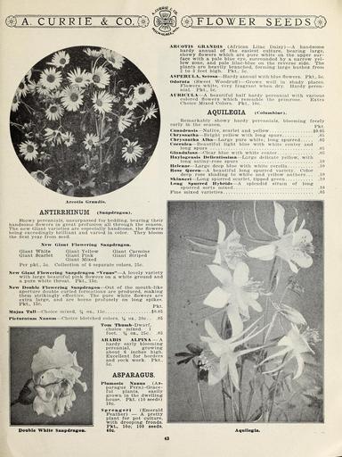 | Keywords: Garden and farm seeds (16436252711).jpg CURRIE CO <br> £ L« <br> FLOWER SEEDS <br> Arcotis Grnndis <br> ANTIRRHINUM Snapdragon <br> Showy perennials unsurpassed for bedding bearing their <br> handsome flowers in great profusion all through the season <br> The new Giant varieties are especially handsome the flowers <br> being exceedingly brilliant and varied in color They bloom <br> the first year from seed <br> New Giant Flowering Snapdragon <br> Giant White Giant Yellow <br> Giant Scarlet Giant Pink <br> Giant Mixed <br> Per pkt 5c Collection of 6 separate colors 25c <br> Giant Carmine <br> Giant Striped <br> New Giant Flowering Snapdragon Venus ” A lovely variety <br> with large beautiful pink flowers on a white ground and <br> a pure white throat Pkt 15c <br> New Double Flowering Snapdragon ” Out of the mouth-like <br> aperture double curled formations are produced making <br> them strikingly effective The pure white flowers are <br> extra large and are borne profusely on long spikes <br> Pkt 15c pkt <br> -Choice mixed oz 15c 0 05 <br> Majus Tall- <br> Picturatum Nanunv ” Choice blotched colors Yi oz <br> 20c <br> Tom Thumb-Dwarf <br> choice mixed 1 <br> foot oz 25c <br> Double White Snapdragon <br> 05 <br> 05 <br> ARABIS ALPINA ” A <br> hardy early blooming <br> perennial growing <br> about 6 inches high <br> Excellent for borders <br> and rock work Pkt <br> 5 c <br> ASPARAGUS <br> Phimosis Nanus As- <br> paragus Fern -Grace- <br> ful plants easily <br> grown in the dwelling <br> house Pkt 10 seeds <br> 10c <br> Sprengert Emerald <br> Feather ” A pretty <br> plant for pot culture <br> with drooping fronds <br> Pkt lOo; 100 seeds <br> 40c <br> ARCOTIS GRANDIS African Lilac Daisy ” A handsome <br> hardy annual of the easiest culture bearing large <br> showy flowers which are pure white on the upper sur- <br> face with a pale blue eye surrounded by a narrow yel- <br> low zone and pale lilac-blue on the reverse side The <br> plants are heavily branched forming large bushes from <br> 2 to 3 feet high Pkt 5c <br> ASPERULA Setosa ” Hardy annual with blue flowers Pkt 5c <br> Odorata Sweet Woodruff ” Grows well in shady places <br> Flowers white very fragrant when dry Hardy peren- <br> nial Pkt 5c <br> AURICULA ” A beautiful half hardy perennial with various <br> colored flowers which resemble the primrose Extra <br> Choice Mixed Colors Pkt 10c <br> AQUILEGIA Columbine <br> Remarkably showy hardy perennials blooming freely <br> early in the season p\tt <br> Canadensis ” Native scarlet and yellow 0 05 <br> Cbrysautha ” Bright yellow with long spurs 05 <br> Clirysantba Alba ” Large pure white; long spurred 05 <br> Coerulea ” Beautiful light blue with white center and <br> long spurs 05 <br> Glandulosa ” Clear blue with white center 05 <br> Haylogensis Delieatissima ” Large delicate yellow with <br> long satiny-rose spurs 10 <br> Helenae ” Large deep blue with white corolla 10 <br> Rose Queen ” A beautiful long spurred variety Color <br> deep rose shading to white and yellow anthers 10 <br> Skinneri ” Long spurred scarlet tipped green 10 <br> Long Spurred Hybrids ” A splendid strain of long <br> spurred sorts mixed 10 <br> Fine mixed varieties 05 <br> Aquilegla <br> 43 42156369 132760 65915 Page 43 Text http //www biodiversitylibrary org/page/42156369 1913 10 5962/bhl title 65915 A Currie Company ; Henry G Gilbert Nursery and Seed Trade Catalog Collection NameFound Aquilegia NameConfirmed Aquilegia EOLID 11205314 NameBankID 2645540 NameFound Arabis alpina NameConfirmed Arabis alpina EOLID 584157 NameBankID 2648388 NameFound Asparagus NameConfirmed Asparagus var pygmaeus Makino EOLID 10487111 NameFound Asperula NameConfirmed Asperula EOLID 11283722 NameBankID 2657134 NameFound Auricula NameConfirmed Auricula EOLID 15518830 NameBankID 241260 NameFound Canadensis NameConfirmed Canadensis Kirby W 1837 NameBankID 5129437 NameFound Glandulosa NameConfirmed Glandulosa EOLID 63989 NameBankID 4549918 NameFound Lilac NameConfirmed Lilac P Miller 1754 NameFound Majus NameConfirmed Majus NameBankID 5328037 NameFound Nanus NameConfirmed Nanus EOLID 73713 NameBankID 2610066 NameFound Picturatum NameFound Setosa NameConfirmed Setosa EOLID 106889 NameBankID 3485568 Biodiversity Heritage Library Garden and farm seeds spring 1913 um Garden Stories Bulbs Plants Catalogs Equipment and supplies Flowers Gardening Nurseries Horticulture Plants Ornamental Seeds Vegetables U S Department of Agriculture National Agricultural Library bhl page 42156369 dc identifier http //biodiversitylibrary org/page/42156369 bhlGardenStories Columbine A Currie Co BHLinbloom bulbs plants nurseries horticulture plants ornamental u s department of agriculture national agricultural library bhlgardenstories a currie co bhlinbloom Information field Flickr posted date ISOdate 2015-02-03 Check categories 2015 August 25 CC-BY-2 0 BioDivLibrary https //flickr com/photos/61021753 N02/16436252711 2015-08-25 01 53 56 cc-by-2 0 PD-old-70-1923 Colombina Garden and farm seeds 1913 Photos uploaded from Flickr by Fæ using a script |