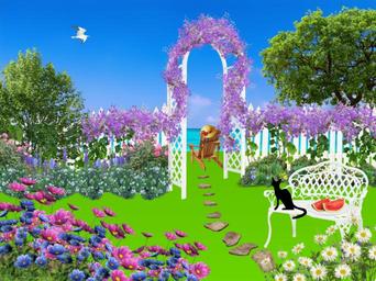 Keywords: garden flowers nature plant pink flowers trees closing bench trail stones adirondack arbour black cat flower bed hat watermelon daisies seagull