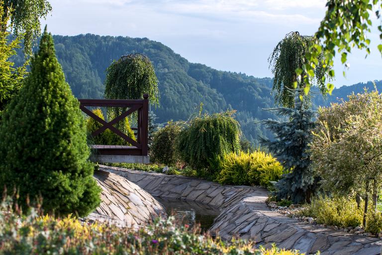 Keywords: garden mountains landscape breathtaking amazing picturesque brook bridge flowers tree europe poland summer blooming nature the senses wallpaper weeping birch coniferous dashing