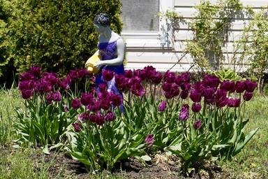 Keywords: garden sculpture lawn statue tulips garden water pitcher purple decoration ornament flowers grass yard