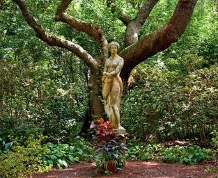 Keywords: garden sculpture statue woman goddess mythical live oak botanical
