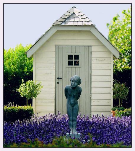 Keywords: garden shed garden figurines romance garden flowers nature flower flora blossom bloom plant purple violet white door garden door cottage door green bed lavender beautiful summer color home cottage fig sculpture statue tree trees decorative bushes