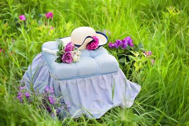Keywords: garden summer pretty hat on a bench flowers meadow green outdoors feminine