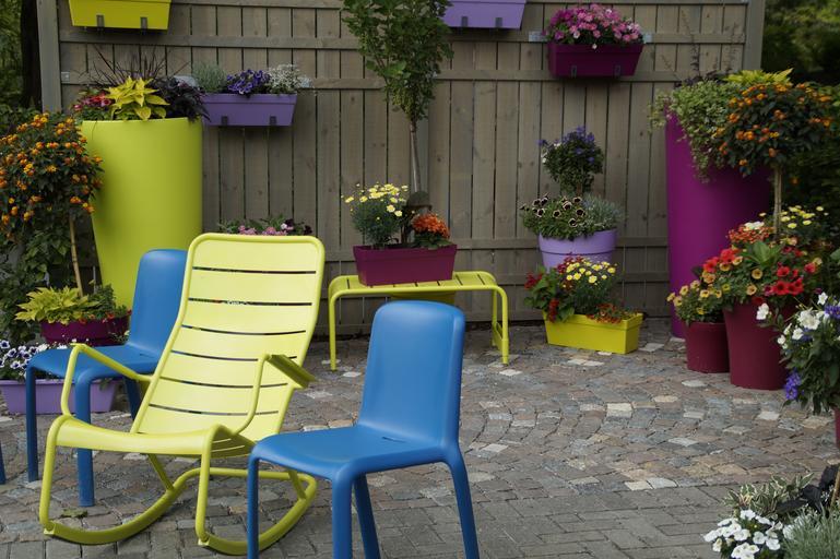 Keywords: garden terrace flower pots flowers planted pots paved seating colorful chair