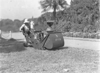 View Original:Gardener_on_Atco_ride-on_lawn_mower,_c._1932,_by_Ted_Hood.jpg (1400x1016)