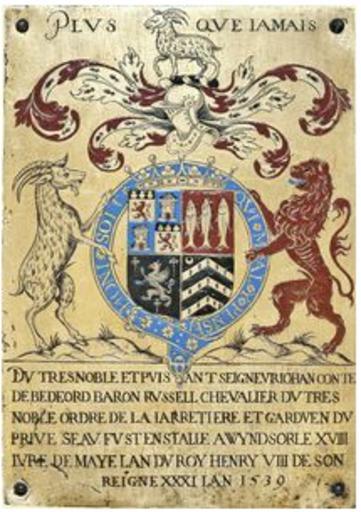 | Keywords: GarterPlateJohnRussell1stEarlOfBedford1539.png quarterly of four 1st grand quarter quarterly 1st 4th Argent a lion rampant gules on a chief sable three escallops of the first Russell ; 2nd 3rd Azure a tower argent de la Tour ; 2nd Gules three herrings hauriant argent Herringham ; 3rd Sable a griffin segreant between three crosses crosslet fitchy argent Froxmere ; 4th Sable three chevronnels ermine in dexter chief a crescent or for difference Wyse <ref>www middlesex-heraldry org uk Heraldry of the Bedford Chapel Chenies Bucks </ref> Crest A goat statant argentarmed and unguled or; Supporters Dexter A goat argent Sinister A lion rampant gules Debrett's Peerage 1968 p 131 with supporters on exchanged sides Motto Plus que Jamais More than Never Inscription Du tres noble et puisant Seigneur Johan Conte de Bedford Baron Russell Chevalier du tres noble Ordre de la Jarretiere et Garduen du Prive Seau fust enstalle a Wyndsor le XVIII jure de Maye l'an du Roy Henry VIII de son reigne XXXI l'an 1539 Of the very noble and powerful Lord John Earl of Bedford Baron Russell Knight of the Very Noble Order of the Garter and Keeper of the Privy Seal was installed at Windsor the 18th day of May the year of King Henry VIII of his reign the 31st the year 1539 References <references/> http //www royalcollection org uk/microsites/knightsofthegarter/MicroObject asp row 13 themeid 455 item 14 Artist unknown Uploaded by Lobsterthermidor <span class signature-talk >talk</span> 12 38 21 November 2013 UTC circa 1539 Nominated to KG 1539 PD-old-100 Stall plates of Knights of the Garter Henry VIII of England John Russell 1st Earl of Bedford |