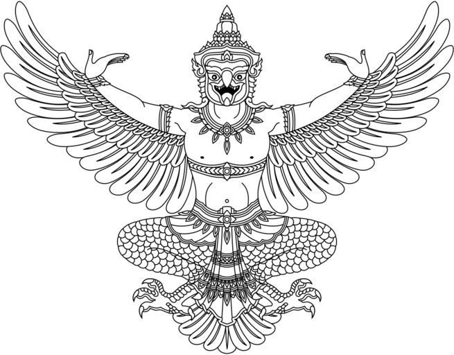 | Keywords: Garuda Emblem of Thailand (Monochrome 2).svg en National Emblem of Thailand depicting a dancing Garuda with outstretched wings The Garuda symbolizes the government and people of Thailand as Lord Vishnu symbolizes King of Thailand th พระราชลัญจกรพระครุฑพ่าห์ ซึ่ง ป็นตราแ ่นดินของประ ทศไทย ป็นรูปครุฑรำกางกร แขน สยายปักษ์ ปีก พระราชลัญจกรองค์นี้แสดงถึงรัฐบาลและปวงชนชาวไทย ในขณะที่พระวิษณุ ู้ประทับบนหลังครุฑ แสดงถึงพระมหากษัตริย์ไทย 2012-05-25 own Based on the version on the front cover of Thai Government Gazette Image Thai Garuda Emblem Government Gazette Ver 001 jpg Sodacan Inkscape PD-Thailand Insignia cc-by-sa-3 0 Similar images <center><gallery> File Garuda Emblem of Thailand Broad wings svg Garuda Emblem of Thailand Broad wings File Garuda Emblem of Thailand Royal Warrant svg Royal Warrant of Appointment File Tra Krut svg Alternate rendering </gallery></center> Other versions <center><gallery> File Garuda Emblem of Thailand svg Garuda Emblem of Thailand File Thai Garuda emblem svg Alternate rendering File Garuda Emblem of Thailand Royal Thai Government Gazette svg Royal Thai Government Gazette File Garuda Emblem of Thailand Monochrome svg Government documents File Garuda Emblem of Thailand Gold svg Gold </gallery></center> Garuda in heraldry Coats of arms of Thailand 2 Garuda emblem of Thailand 2 SVG coats of arms of Thailand 2 |