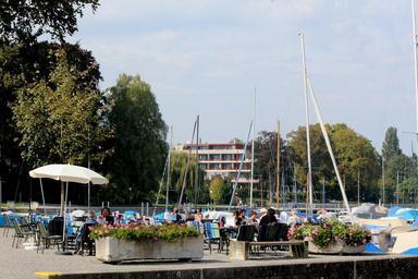 Keywords: gastronomy beach cafe guests boat harbour lake constance romanshorn