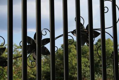 Keywords: gate metal decorative design leaves tendrils trees sky