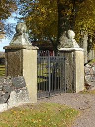 Keywords: gateposts stone grind wrought grass countryside tree autumn wall
