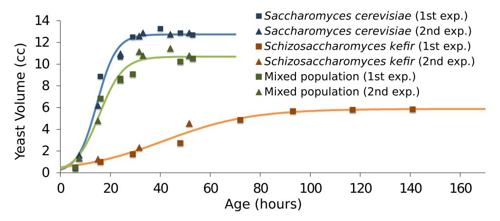 | Keywords: Gause's experiment and fitted logistic curves.svg ja ガウゼの実験結 <ref name Gause1932 > cite journal Gause G F 1932 Experimental Studies on the Struggle for Existence http //jeb biologists org/content/9/4/389 Journal of Experimental Biology The Company of Biologists Ltd 9 4 389-402 1477-9145 </ref>とレーベンバーグ・マーカート法でフィッティングさせたロジスティック曲線 <math>N \frac K 1+ K/N_0-1 e -rt </math> 下記のScilab(lsqrsolve)を使用して各パラメータ(r K N<sub>0</sub>)を求めた れらをもとにExcelでグラフ 成 InkscapeでSVG化 各曲線のパラメータは以下のとおり Saccharomyces cerevisiae N<sub>0</sub> 0 2831294 K 12 742142 r 0 2586369 Schizosaccharomyces kefir N<sub>0</sub> 0 4970908 K 5 8802335 r 0 0574421 Mixed population N<sub>0</sub> 0 3796836 K 10 690843 r 0 2116539 グラフ中の各 体群成長データはガウゼの論文のTable Iのデータを使用した en This figure shows Gause's experiment results<ref name Gause1932 /> and logistic curves fitted with Levenberg-Marquardt Method Logistic curve can be written as <math>N \frac K 1+ K/N_0-1 e -rt </math> Below Scilab lsqrsolve code was used to fit the parameters r K N<sub>0</sub> The fitted parameters of each curve are shown as follows Saccharomyces cerevisiae N<sub>0</sub> 0 2831294 K 12 742142 r 0 2586369 Schizosaccharomyces kefir N<sub>0</sub> 0 4970908 K 5 8802335 r 0 0574421 Mixed population N<sub>0</sub> 0 3796836 K 10 690843 r 0 2116539 The population growth data used in this graph are derived from Table I of Gause's paper <references /> 2016-02-13 own Yapparina other versions File Gause's experiment and fitted logistic curves single species svg Scilab source <source lang scilab > clear all; //data of Saccharomyces cerevisiae t1 6 7 5 15 16 24 24 29 31 5 33 40 44 48 51 5 53; y1 0 37 1 63 6 2 8 87 10 66 10 97 12 5 12 6 12 9 13 27 12 77 12 87 12 9 12 7; //th 1 N0 th 2 K th 3 r function e fun1 th m e y1-th 2 / 1+ th 2 /th 1 -1 exp -th 3 t1 ; endfunction parm v lsqrsolve 0 1;12;0 1 fun1 size t1 2 ; parm //data of Schizosaccharomyces kefir t2 15 16 29 31 5 48 51 5 72 93 117 141; y2 1 27 1 1 7 2 33 2 73 4 56 4 87 5 67 5 8 5 83; //th 1 N0 th 2 K th 3 r function e fun2 th m e y2-th 2 / 1+ th 2 /th 1 -1 exp -th 3 t2 ; endfunction parm v lsqrsolve 0 1;6;0 1 fun2 size t2 2 ; parm //data of Mixed population t3 6 7 5 15 16 24 24 29 31 5 33 44 48 51 5 53; y3 0 5 1 33 4 8 6 83 8 66 8 57 9 07 11 17 10 8 11 47 10 23 10 8 10 5; //th 1 N0 th 2 K th 3 r function e fun3 th m e y3-th 2 / 1+ th 2 /th 1 -1 exp -th 3 t3 ; endfunction parm v lsqrsolve 0 1;11;0 1 fun3 size t3 2 ; parm </source> cc-zero Logistic functions |