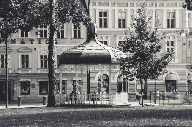Keywords: gazebo city town village people buildings architecture windows black and white