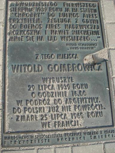 | Keywords: Gdynia Gombrowicz.jpg Tablica pamiątkowa Witolda Gombrowicza w porcie gdyńskim Gedenktafel für den Schriftsteller Witold Gombrowicz im Hafen Gdynia Memorial plate of writer Witold Gombrowicz in the sea-port Gdynia own 2007-09-23 Jerzy Port of Gdynia Witold Gombrowicz plaque in Gdynia |