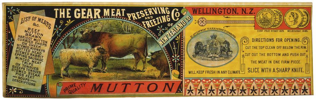 | Keywords: Shows a bull sheep and part of a pig in a pasture setting, inside decorative border, with a list of other meat products down the left side. Other end of label has directions for opening the tin, and reports a first prize at Sydney in 1879, and at Melbourne in 1880. Inscriptions: Inscribed - Recto - centre: Schmidt Label & Lith Co., S K Cal. USA. Dated by labels reporting prizes in 1879 and 1880. Quantity: 1 colour photo-mechanical print(s). Physical Description: Chromolithograph, label for tin, 107 x 345 mm. Provenance: Deposited by Gear Meat Company in 1981. Schmidt Label & Litho Company. Gear Meat Company :Prime quality. The Gear Meat Preserving and Freezing Co. of New Zealand Ld. Prime quality mutton. List of meats. [1880-1890s].. Gear Meat Company :Scrapbook of labels. 1890s-1920s].. Ref: Eph-F-MEAT-Gear-018-1. Alexander Turnbull Library, Wellington, New Zealand. natlib.govt.nz/records/22698472 Shows a bull sheep and part of a pig in a pasture setting, inside decorative border, with a list of other meat products down the left side. Other end of label has directions for opening the tin, and reports a first prize at Sydney in 1879, and at Melbourne in 1880. Inscriptions: Inscribed - Recto - centre: Schmidt Label & Lith Co., S K Cal. USA. Dated by labels reporting prizes in 1879 and 1880. Quantity: 1 colour photo-mechanical print(s). Physical Description: Chromolithograph, label for tin, 107 x 345 mm. Provenance: Deposited by Gear Meat Company in 1981. Schmidt Label & Litho Company. Gear Meat Company :Prime quality. The Gear Meat Preserving and Freezing Co. of New Zealand Ld. Prime quality mutton. List of meats. [1880-1890s].. Gear Meat Company :Scrapbook of labels. 1890s-1920s].. Ref: Eph-F-MEAT-Gear-018-1. Alexander Turnbull Library, Wellington, New Zealand. natlib.govt.nz/records/22698472 |