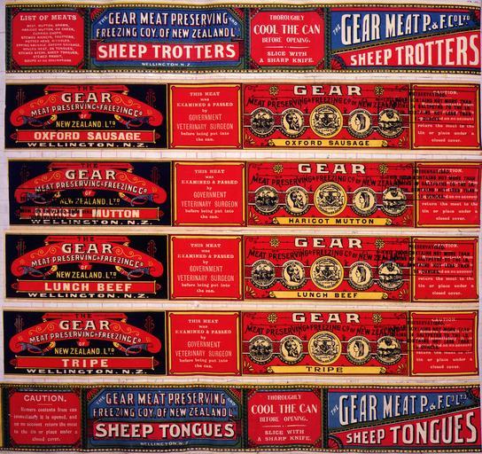 | Keywords: text bright Each label is an arrangement of text and medals. Top and bottom labels are lithographed by Turnbull, Hickson & Gooder, Wellington. Quantity: 6 colour art print(s) on labels.. Physical Description: Chromolithographs, on labels, each approximately 50 x 340 mm. Provenance: Deposited by Gear Meat Company in 1981. Turnbull, Hickson & Gooder, Ltd.. Gear Meat Company :[Six labels for Sheep trotters; Oxford sausage; Haricot mutton; Lunch beef; Tripe; and, Sheep tongues]. Gear Meat Preserving & Freezing Company of New Zealand, Wellington New Zealand. [1890-1920].. Gear Meat Company :Scrapbook of labels. 1890s-1920s].. Ref: Eph-F-MEAT-Gear-036. Alexander Turnbull Library, Wellington, New Zealand. natlib.govt.nz/records/22337722 Each label is an arrangement of text and medals. Top and bottom labels are lithographed by Turnbull, Hickson & Gooder, Wellington. Quantity: 6 colour art print(s) on labels.. Physical Description: Chromolithographs, on labels, each approximately 50 x 340 mm. Provenance: Deposited by Gear Meat Company in 1981. Turnbull, Hickson & Gooder, Ltd.. Gear Meat Company :[Six labels for Sheep trotters; Oxford sausage; Haricot mutton; Lunch beef; Tripe; and, Sheep tongues]. Gear Meat Preserving & Freezing Company of New Zealand, Wellington New Zealand. [1890-1920].. Gear Meat Company :Scrapbook of labels. 1890s-1920s].. Ref: Eph-F-MEAT-Gear-036. Alexander Turnbull Library, Wellington, New Zealand. natlib.govt.nz/records/22337722 |