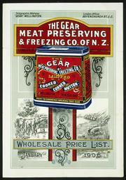 | Keywords: Price list has attractive engraved front showing a tin of cold cooked mutton, against a background of sheep and cattle grazing on either side of a stream. The back lists the prices of mutton, fancy goods, beef, soups, tongues, potted pastes, and extract of meat. Quantity: 1 colour photo-mechanical print(s). Physical Description: Photolithograph and letterpress on both sides of sheet, 230 x 159 mm. Provenance: Transferred from MS 81-295 (Box 35) in 2002 - Gear Meat Company papers. Transfers: FMSA - 81-295, box 35.. Gear Meat Preserving & Freezing Company of New Zealand Ltd :Wholesale price list, January 1906. [and] Gear corned beef [ca 1900?]. [Ephemera relating to meat, the meat industry, cookery. 1900-1919]. Ref: Eph-A-MEAT-1906-01. Alexander Turnbull Library, Wellington, New Zealand. natlib.govt.nz/records/22819359 Price list has attractive engraved front showing a tin of cold cooked mutton, against a background of sheep and cattle grazing on either side of a stream. The back lists the prices of mutton, fancy goods, beef, soups, tongues, potted pastes, and extract of meat. Quantity: 1 colour photo-mechanical print(s). Physical Description: Photolithograph and letterpress on both sides of sheet, 230 x 159 mm. Provenance: Transferred from MS 81-295 (Box 35) in 2002 - Gear Meat Company papers. Transfers: FMSA - 81-295, box 35.. Gear Meat Preserving & Freezing Company of New Zealand Ltd :Wholesale price list, January 1906. [and] Gear corned beef [ca 1900?]. [Ephemera relating to meat, the meat industry, cookery. 1900-1919]. Ref: Eph-A-MEAT-1906-01. Alexander Turnbull Library, Wellington, New Zealand. natlib.govt.nz/records/22819359 |