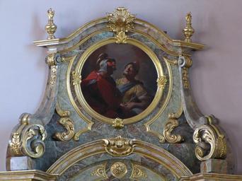 | Keywords: Geispolsheim SteMarguerite90.JPG Alsace Bas-Rhin Geispolsheim Église Sainte-Marguerite Autel secondaire de Saint-Sébastien 1772 own 2015 Ralph Hammann cc-by-sa-4 0 Artwork / Œuvre d'art / Kunstwerk oil canvas 80 cm de diamètre Eglise Sainte-Marguerite Geispolsheim Autel secondaire PM67000092 IM67000193 object history Autel et retable par François Antoine Ketterer exécuté entre 1771 et 1772 ; tableau du martyr de saint Sébastien par Monique Danisch daté 1778 other versions Ralph Hammann PD-old accession number Taken with Canon PowerShot SX20 IS Photographs of Geispolsheim by Ralph Hammann Autel de Saint-Sébastien Geispolsheim Baroque church paintings in Alsace Objets monuments historiques in Bas-Rhin church paintings 18th-century church paintings in Alsace Paintings of Saint John the Apostle Paintings of Saint Paul in France 18th-century paintings of Saint Paul |