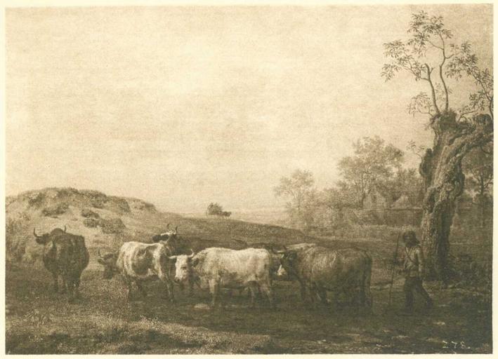 | Keywords: Gemäldegalerie Alte Meister (Dresden) Galeriewerk Lücke 069.jpg Artwork Creator Paulus Potter Ein Rinderhirt mit seiner Herde Reproduktion in Heliogravüre vermisst Gal -Nr 1629 missing gallery-nr 1629 Institution Gemäldegalerie Alte Meister Dresden Beschreibung aus Karl Woermanns Galeriekatalog 1887 Ein Rinderhirt mit seiner Heerde Der Hirt schreitet nach links gewandt rechts vorn vor einem alten Weidenbaume hinter seinen sechs Rindern her In der Mitte des Mittelgrundes auf einer kleinen Anhöhe ein Wagen Im Hintergrunde ein Kirchturm Rechts im Mittelgrunde ein Bauernhof unter Bäumen Bezeichnet links unten 350px center <small>Eichenholz; h 0 36; br 0 49½ m</small> Die Königliche Gemäldegalerie zu Dresden Text von Hermann Lücke; Teil II Niederländische Deutsche Französische und Spanische Schulen München Franz Hanfstaengl ohne Jahr ca 1897 ; self scanned from own book PD-old-100 Other versions <gallery>File Gemäldegalerie Alte Meister Dresden Galeriewerk Braun 1529 jpg</gallery> Gemäldegalerie Alte Meister Dresden Galeriewerk Lücke Paintings formerly in the Gemäldegalerie Alte Meister Dresden Paintings by Paulus Potter |