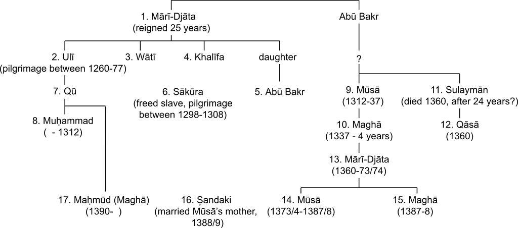 | Keywords: Genealogy kings Mali Empire.svg en Genealogy of the kings of Mali based on the chronicle of Ibn Khaldun as interpreted by Nehemia Levtzion He first published the genealogy in his paper citation Levtzion N 1963 The thirteenth- and fourteenth-century kings of Mali Journal of African History 4 3 341-353 180027 He republished the genealogy in citation Levtzion Nehemia Ancient Ghana and Mali Methuen London 1973 0841904316 and citation Levtzion Nehemia Hopkins John F P Corpus of Early Arabic Sources for West Africa Marcus Weiner Press New York NY 2000 1-55876-241-8 425 First published in 1981 by Cambridge University Press ISBN 0521224225 2011-06-25 own Aa77zz cc-zero Uploaded with UploadWizard History of West Africa |