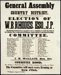 | Keywords: text writing monochrome Arrangement of text. Lists Rhodes' backers as follows: Wm Hickson, Matthew Hammond, C W Schultze, J W M'Kaine, William Galpin, Thomas Phillips, George Crawford, John Martin, Thomas Ring, James McBeth, George Buck, John McBeth, Thomas Morgan, Robert Jillett, John King, John Johnston, William Bowler, J Smith (Ohariu), Nathaniel Bartlett, James Barnes, Benjamin Jefferson, James Mitchell, Robert Waitt, John Glasgow, Edward Roe, Richard Hammond, James Hallett, J D McMannaway, John Gibson, James Calder, John Campbell, Stephen Stockbridge, John Symons, William Allen, R D Wallace, P M Hervey, Francis Bradey, W S Loxley, W Bromley, Robert Bould, Anthony Wall, Donald Ferguson, W Tankersley, John Nicol, George Edwards. Honorary secretary J H Wallace. Committee rooms at Mr M'Kaine's, Half-Way House, Mr Calder's, Rainbow Hotel, Barrett's Hotel. Some of the letter J type is in lower case. Quantity: 1 b&w art print(s). Physical Description: Letterpress on paper, 750 x 605 mm. General Assembly, Country district. Election of W. B. Rhodes, esq., J.P. The following gentlemen have consented to act as a committee to secure the return of W B Rhodes, esq, to represent the Wellington Country District in the General Assembly. ... Wellington, August 11, 1853.. Ref: Eph-E-POLITICS-1853-01. Alexander Turnbull Library, Wellington, New Zealand. natlib.govt.nz/records/22434044 Arrangement of text. Lists Rhodes' backers as follows: Wm Hickson, Matthew Hammond, C W Schultze, J W M'Kaine, William Galpin, Thomas Phillips, George Crawford, John Martin, Thomas Ring, James McBeth, George Buck, John McBeth, Thomas Morgan, Robert Jillett, John King, John Johnston, William Bowler, J Smith (Ohariu), Nathaniel Bartlett, James Barnes, Benjamin Jefferson, James Mitchell, Robert Waitt, John Glasgow, Edward Roe, Richard Hammond, James Hallett, J D McMannaway, John Gibson, James Calder, John Campbell, Stephen Stockbridge, John Symons, William Allen, R D Wallace, P M Hervey, Francis Bradey, W S Loxley, W Bromley, Robert Bould, Anthony Wall, Donald Ferguson, W Tankersley, John Nicol, George Edwards. Honorary secretary J H Wallace. Committee rooms at Mr M'Kaine's, Half-Way House, Mr Calder's, Rainbow Hotel, Barrett's Hotel. Some of the letter J type is in lower case. Quantity: 1 b&w art print(s). Physical Description: Letterpress on paper, 750 x 605 mm. General Assembly, Country district. Election of W. B. Rhodes, esq., J.P. The following gentlemen have consented to act as a committee to secure the return of W B Rhodes, esq, to represent the Wellington Country District in the General Assembly. ... Wellington, August 11, 1853.. Ref: Eph-E-POLITICS-1853-01. Alexander Turnbull Library, Wellington, New Zealand. natlib.govt.nz/records/22434044 |