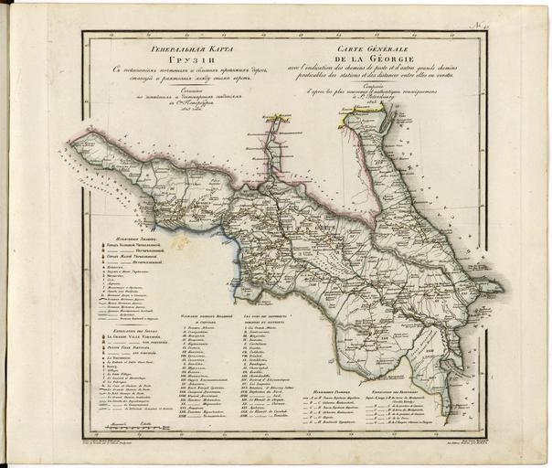 | Keywords: General Map of Georgia. Showing Postal and Major Roads, Stations and the Distance in Versts Between Them- According to the Latest Verified Data in St. Petersburg in 1823 WDL2437.png  Artwork ru Пядишев Василий Пет ович fr Piadyshev Vasiliĭ Petrovich en Piadyshev Vasiliĭ Petrovich zh 帕迪谢乌 瓦西利·佩特罗维奇 pt Piadyshev Vasiliĭ Petrovich ar بياديشيف فاسيليي بيتروفيتش es Piadyshev Vasiliĭ Petrovic ru Общая ка та Г узии Изоб ажение почтовой и основных до ог станций и  асстояний между ними в ве стах Согласно последним п ове енным сведениям в Санкт- Пете бу ге в 1823 г fr Carte générale de la Géorgie Routes postales et principales gares et distances en verstes entre elles Selon les dernières données analysées à Saint- en General Map of Georgia Showing Postal and Major Roads Stations and the Distance in Versts Between Them According to the Latest Verified Data in St Petersburg in 1823 zh 格鲁吉亚普  图  显示邮政和主要道路,车站和车站之间的俄里 离  根据1823年 彼得堡 新确认数据 pt Mapa Geral da Geórgia Mostrando as rotas postais e os principais eixos rodoviários estações e a distância em versts entre eles Conforme os mais recentes dados verificados em São Petersburgo em 1823 ar خريطة عامة لجورجيا تظهر الطرق البريدية والرئيسية، والمحطات والمسافة في الفرست بينهم بطرسبورغ في 1823 ru Данная ка та 1823 года на кото ой изоб ажена те  ито ия Г узии входит в <i> Геог афический атлас Российской импе ии Ца ства Польского и Великого княжества Финляндского </i> в кото ом соб ана 61 ка та Российской импе ии Атлас был составлен и отпечатан полковником В П Пядышевым; он является свидетельством того насколько тщательно и под обно составлялись ка ты  усскими военными ка тог афами пе вой четве ти XIX века  а ка те показаны к упнейшие го ода семь типов в зависимости от  азме ов го ода к епости цитадели и фо ты монасты и и пустыни заводы и фаб ики почтовые дво ы и станции до оги т и типа и г аницы госуда ственные и г аницы п овинций Расстояния указаны в ве стах  ве ста являлась  усской единицей изме ения длины  авной 1 0668 км кото ая к настоящему в емени вышла из упот ебления Условные обозначения и геог афические названия п иведены на  усском и ф анцузском языках Изоб аженная те  ито ия  в общих че тах соответствует те  ито ии сов еменной Г узии fr Cette carte de 1823 de la Géorgie est issue de travaux plus importants <i>L'Atlas géographique de l'Empire russe du Royaume de Pologne et du Grand-Duché de Finlande</i> Geograficheskii atlas Rossiiskoi imperii tsarstva Pol'skogo i Velikogo kniazhestva Finliandskogo contenant 61 cartes de l'Empire russe Compilée et gravée par le colonel V P Piadyshev elle reflète la cartographie détaillée effectuée par les cartographes militaires russes au cours du premier quart du 19ème siècle La carte montre les centres de population sept gradations par taille les forteresses les redoutes et les forts les monastères et les déserts les plantes et les usines les relais et stations de poste les routes trois types et les frontières des États et des provinces Les distances sont indiquées en verstes une unité de mesure russe qui n'est plus utilisée égale à 1 0668 kilomètre Les légendes et les noms de lieux sont en russe et en français Le territoire représenté sur la carte correspond approximativement à celui de l'actuelle Géorgie en This 1823 map of Georgia is from a larger work <i>Geographical Atlas of the Russian Empire the Kingdom of Poland and the Grand Duchy of Finland</i> Geograficheskii atlas Rossiiskoi imperii tsarstva Pol'skogo i velikogo kniazhestva Finliandskogo containing 61 maps of the Russian Empire Compiled and engraved by Colonel V P Piadyshev it reflects the detailed mapping carried out by Russian military cartographers in the first quarter of the 19th century The map shows population centers seven gradations by size fortresses redoubts and forts monasteries and deserts plants and factories postal courtyards and stations roads three types and borders state and provincial Distances are shown in versts a Russian measure now no longer used equal to 1 0668 kilometers Legends and place names are in Russian and French The territory depicted on the map roughly corresponds to that of present-day Georgia zh 这幅 1823 年的格鲁吉亚 图出自 部巨 <i> 俄罗斯 国 波兰王国和芬兰大公国 理 图集 </i> (Geograficheskii atlas Rossiiskoi imperii tsarstva Pol'skogo i velikogo kniazhestva Finliandskogo),该 图集共包括 61 幅俄罗斯 国 图  这幅 图集由 V·P·Piadyshev 上校编制和刻版, 反映了 19 世纪前 25 年间俄罗斯军事制图师 达到的碎部测图水平  该 图标注了人口中心(根据大小分成七个等级) 要塞 小型防御工事与堡垒 修道院与沙漠 工厂 邮 和车站 道路(三种)以及 和 区的边界   离采用的单位是俄里,该单位目前已不再使用,1 俄里等于 1 0668 公里  图例和 名采用俄语和法