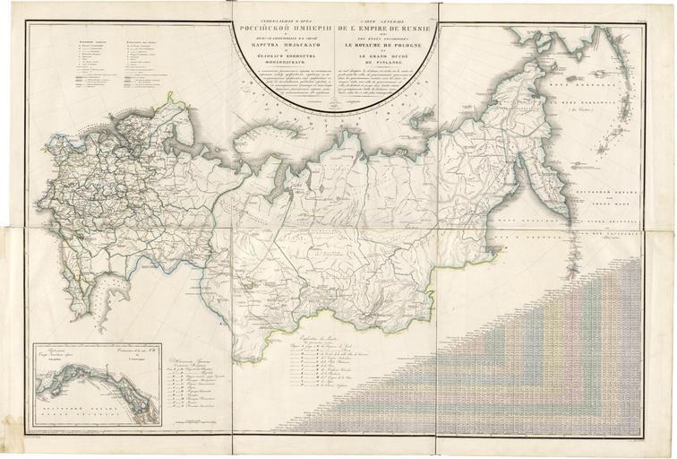 | Keywords: General Map of the Russian Empire and the Neighboring Polish Empire and Grand Duchy of Finland- With the Distance in Versts on Postal Roads Between Provincial Cities; and in Boundary Provinces from WDL2589.png  Artwork ru Пядишев Василий Пет ович fr Piadyshev Vasiliĭ Petrovich en Piadyshev Vasiliĭ Petrovich zh 帕迪谢乌 瓦西利·佩特罗维奇 pt Piadyshev Vasiliĭ Petrovich ar بياديشيف فاسيليي بيتروفيتش es Piadyshev Vasiliĭ Petrovic ru Общая ка та Российской импе ии соседней Польской импе ии и Великого княжества Финляндия Расстояния между п овинциальными го одами указываются в ве стах на почтовых до огах; в пог аничных п овинциях - от п овинциального го ода fr Carte générale de l'Empire Russe et de l'Empire voisin Polonais et du Grand-Duché de Finlande Avec la distance en verstes des routes postales entre les villes de province et les provinces limitrophes en General Map of the Russian Empire and the Neighboring Polish Empire and Grand Duchy of Finland With the Distance in Versts on Postal Roads Between Provincial Cities; and in Boundary Provinces from the Provincial City zh 俄罗斯 国以及邻国波兰 国和芬兰大公国 般 图  级城市之间邮政公路俄里 离; 级城市到边界 的邮政公路俄里 离 pt Mapa geral do império russo e do império polaco vizinho e do Grão-Ducado da Finlândia Com a distância em versts das rotas postais entre cidades da província; e das Províncias Fronteiriças da Cidade Provincial ar خريطة عامة للامبراطورية الروسية والامبراطورية البولندية المجاورة لها ودوقية فنلندا الكبرى مع المسافة في الفيرست للطرق البريدية بين المدن الإقليمية؛ وحدود الأقاليم من المدينة الإقليمية ru Данная ка та Российской импе ии 1827 года входит в объемный т уд  <i> Геог афический атлас Российской импе ии ца ства Польского и великого княжества Финляндского </i> в кото ом соб аны 61 ка та Российской импе ии Атлас был составлен и отпечатан полковником В П Пядышевым  Он является свидетельством того насколько тщательно и под обно составлялись ка ты  усскими военными ка тог афами пе вой четве тиXIX века  а ка те показаны к упнейшие го ода пять типов в зависимости от  азме а к епости цитадели заводы и фаб ики до оги четы е типа госуда ственные г аницы и г аницы п овинций Расстояния указаны в ве стах  ве ста являлась  усской единицей изме ения длины  авной 1 0668 км кото ая к настоящему в емени вышла из упот ебления Условные обозначения и геог афические названия п иведены на  усском и ф анцузском языках fr Cette carte de 1827 de l'Empire russeest extraite d'un ouvrage plus vaste <i>Atlas géographique de l'Empire russe du Royaume de Pologne et du Grand-Duché de Finlande</i> Geograficheskii atlas Rossiiskoi imperii tsarstva Pol'skogo i Velikogo kniazhestva Finliandskogo contenant 61 cartes de l'Empire russe Compilé et gravé par le colonel V P Piadyshev elle reflète la cartographie détaillée effectuée par les cartographes militaires russes durant le premier quart du 19ème siècle La carte indique les centres urbains cinq gradations selon la taille les forteresses redoutes usines et fabriques les routes quatre types les frontières des provinces et districts Les distances sont indiquées en verstes une unité de mesure russe qui n'est maintenant plus utilisée égale à 1 0668 kilomètre Les légendes et noms de lieux sont en russe et en français en This 1827 map of the Russian Empire is from a larger work <i>Geographical Atlas of the Russian Empire the Kingdom of Poland and the Grand Duchy of Finland</i> Geograficheskii atlas Rossiiskoi imperii tsarstva Pol'skogo i velikogo kniazhestva Finliandskogo containing 61 maps of the Russian Empire Compiled and engraved by Colonel V P Piadyshev it reflects the detailed mapping carried out by Russian military cartographers in the first quarter of the 19th century The map shows population centers five gradations by size fortresses redoubts plants and factories roads four types and state and provincial borders Distances are shown in versts a Russian measure now no longer used equal to 1 0668 kilometers Legends and place names are in Russian and French zh 这幅 1827 年的俄罗斯 国 图出自较大型的 图集 <i> 俄罗斯 国 波兰王国和芬兰大公国 理 图集 </i> (Geograficheskii atlas Rossiiskoi imperii tsarstva Pol'skogo i velikogo kniazhestva Finliandskogo),该 图集共包括 61 幅俄罗斯 国 图  这幅 图集由 V·P·Piadyshev 上校编制和刻版, 反映了 19 世纪前 25 年间俄罗斯军事制图师 达到的详细制图水平     该 图标注了人口中心(根据大小分成五个等级) 要塞 小型防御工事 工厂 道路(四种)以及 和 区的边界   离采用的单位是俄里,该单位目前已不再使用,1 俄里等于 1 0668 公里  图例和 名采用俄语和法语标注  pt Este mapa do Império Russo de 1827   provém de um trabalho maior <i>Atlas Geográfico do Império Russo do Reino da Polônia e do Grão-Ducado da Finlândia</i> G