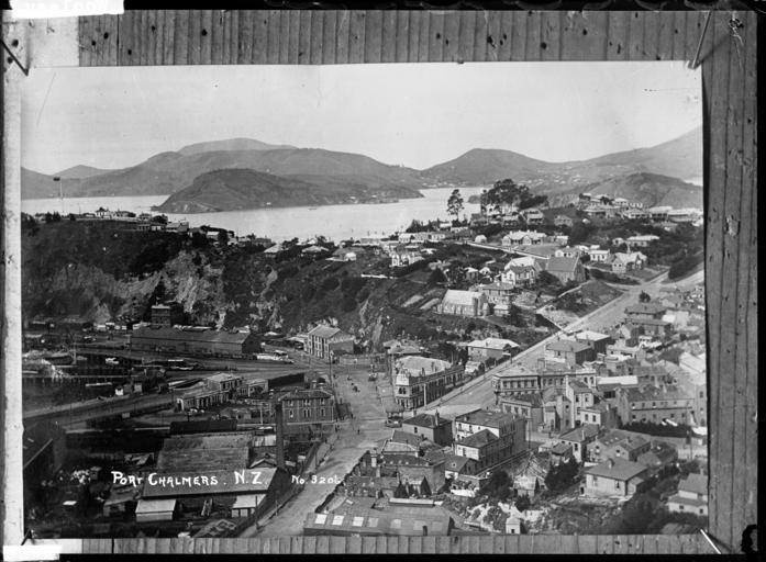| Keywords: blackandwhite monochrome photo border outdoor black and white View of Port Chalmers taken from a vantage point overlooking the township and looking south towards the harbour, Quarantine Island and the Peninsula. The harbour and buildings on the waterfront are on the left. Photograph taken by William A Price in the early 1900s. Inscriptions: Inscribed - Photographer's title on negative -bottom left: Port Chalmers. NZ. No 3206. Quantity: 1 b&w original negative(s). Physical Description: Dry plate glass negative 4.75 x 6.5 inches General view of Port Chalmers. Price, William Archer, 1866-1948 :Collection of post card negatives. Ref: 1/2-001248-G. Alexander Turnbull Library, Wellington, New Zealand. natlib.govt.nz/records/22794654 View of Port Chalmers taken from a vantage point overlooking the township and looking south towards the harbour, Quarantine Island and the Peninsula. The harbour and buildings on the waterfront are on the left. Photograph taken by William A Price in the early 1900s. Inscriptions: Inscribed - Photographer's title on negative -bottom left: Port Chalmers. NZ. No 3206. Quantity: 1 b&w original negative(s). Physical Description: Dry plate glass negative 4.75 x 6.5 inches General view of Port Chalmers. Price, William Archer, 1866-1948 :Collection of post card negatives. Ref: 1/2-001248-G. Alexander Turnbull Library, Wellington, New Zealand. natlib.govt.nz/records/22794654 |