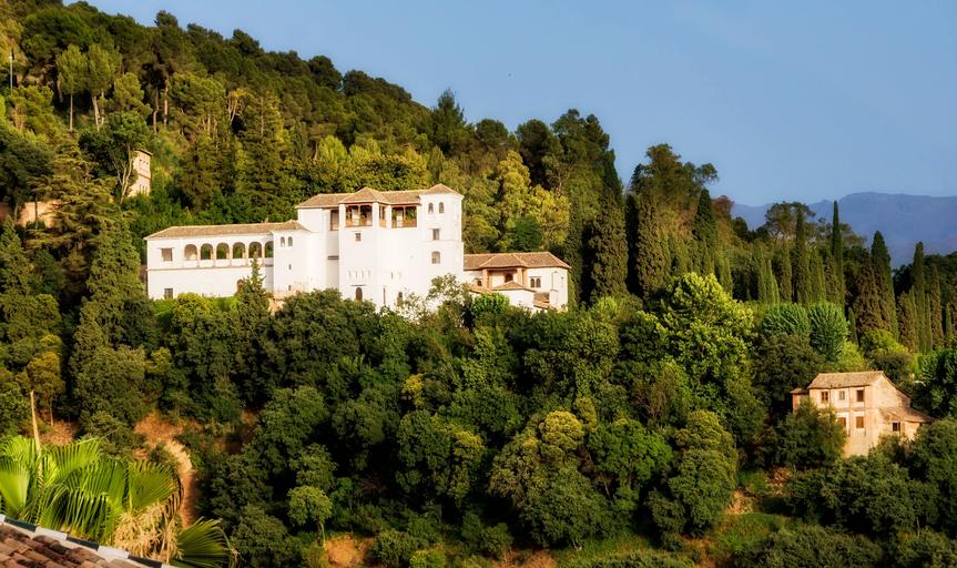 Keywords: generalife palace buildings architecture landmark historical mountains forest trees nature outside country countryside granada spain city cities urban sky