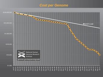 | Keywords: Genome sequencing costs 2011.jpg en From http //www genome gov/sequencingcosts DNA Sequencing Costs Data from the NHGRI Large-Scale Genome Sequencing Program Accessed 11 December 2011 This is the general cost across the industry for producing the sequence data for a human-sized genome Considerations have been made for the different amounts of sequencing coverage required for different sequencing technologies Specifically 6x for Sanger sequencing 10x for 454 30x for Illumina and SOLiD Details of what was counted as sequence production costs Labor administration management utilities reagents and consumables Sequencing instruments and other large equipment amortized over three years Informatics activities directly related to sequence production e g laboratory information management systems and initial data processing Shotgun library construction required for preparing DNA to be sequenced Submission of data to a public database http //oamp od nih gov/dfas/faqIndirectCosts asp difference Indirect Costs as they relate to the above items See http //www genome gov/sequencingcosts genome gov/sequencingcosts for full assumptions used PD-USGov-NIH 2011-12-13 NHGRI http //www genome gov/sequencingcosts www genome gov/sequencingcosts Wetterstrand KA PD-USGov Uploaded with UploadWizard DNA sequencing Genetics National Institutes of Health Genome gov images Genomics |