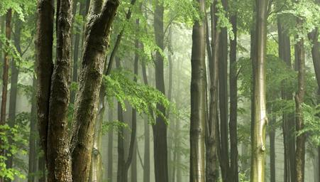 Keywords: gentle light tree trunks after the rain wet haze fog diffuse light mood spring reflections trees nature lužný les leaves the foliage forest feeling the scent of the forest fresh air green walk background banner