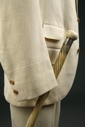 | Keywords: Gentlemannen - om män och mode - Hallwylska museet - 85871.tif KOSTYM kavaj- <br/><br/>Bestående av kavaj väst och byxor <br/><br/>Av vit cheviot samt med gulvita benknappar Hand- och maskinsydda <br/><br/>Kavaj Enradig livskuren med fyra knappar samt nedviken krage och korta slag i det vänstra ett knapphål; framstyckenas hörn rundade Ryggen med sid- och axelsömmar Knapparna runda fyrhåliga med plan framsida och stavformig kant Foder av smalrandigt vitt siden alpacka på högra framstycket en bröstficka; ärmfoder av smalrandigt crèmegult halvsiden <br/><br/>Mått Ärmhålsdjup 23 cm ; längd hel 76 cm ; ryggbredd halv 19 cm ; ärmlängd 80 cm ; bröstvidd fram 44 cm ; bröstvidd hel 106 cm ; livvidd 98 cm <br/><br/>Väst Enradig med sex knappar som de mindre i kavajen korta vinkelskurna slag samt två svagt snedskurna sidofickor samt på vänstra framstycket dessutom en dylik bröstficka alla med rak kantslå Ryggstycke av vit ylleklot ett stycke från nedre kanten två spänntampar med spänne av svartlackerad mässing och med två taggar tornar Nedtill i mitten ett sprund Fodret i rygg- och framstycken av blommig vit bomullssatin <br/><br/>Mått Schalöppning 31 cm Hel västlängd 70 cm <br/><br/>Byxor Upptill på vardera framstycket en snedskuren tvärficka Midjeband med hake och hyska knapp och knapphål samt sex hängselknappar Gylfen med fyra små knappar ock knapphål Midjebandet fodrat med rött skinn saffian bak- och gylffoder av vitt bomullstyg Fickor av vitt bomullstyg Knapphålen handsydda med vitt grovt silke eller vit bomullstråd <br/><br/>Mått Yttersöm längd 106 cm ; innersöm längd 82 cm ; livvidd 82 cm ; stussvidd 108 cm ; lårvidd 66 cm ; knävidd 48 cm ; vidd nedtill 46 cm <br/><br/>Förfärdigade efter beställning av Walther von Hallwyl i Oktober 1900 hos skrädderifirman Fr Kaedings Efterträdare Zittorin Lundvik hovleverantörer <br/><br/>Begagnad av Walther von Hallwyl under hans resa genom Egypten och Sudan tillsammans med sin maka dotter och svärson samt fröken Ida Uhse den 5 November 1900 till 29 Mars 1901 original caption Gentlemannen - om män och mode HWY Walther von Hallwyl place of origin Stockholm SE original filename hm_dig1922 8246 inventory number HWY XXI I A 03 85871 CC-BY-SA Samuel Uhrdin <gallery caption Different images of same object > File Kavajkostym bestående av kavaj väst och byxor Tillhört Walther von Hallwyl - Hallwylska museet - 89103 tif File Gentlemannen - om män och mode - Hallwylska museet - 85872 tif File Gentlemannen - om män och mode - Hallwylska museet - 85873 tif File Detalj av kostym Foto till boken Ett sekel av dräkt och mode ur de Hallwylska samlingarna - Hallwylska museet - 89347 tif File Kostym detalj Foto till boken Ett sekel av dräkt och mode ur de Hallwylska samlingarna - Hallwylska museet - 89386 tif </gallery> Samuel Uhrdin Clothing in the Hallwyl museum Male clothing Trousers Media contributed by LSH unmatched objKeyword Media contributed by LSH unmatched creator Media contributed by LSH 2013-10 |