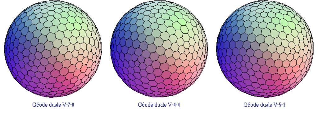 Keywords: Géodes V duales.PNG Trois exemples de géodes duales de paramètre V in english dual geodesic domes 2005-09-14 own assumed Papy77 Theory of the dome Spheres