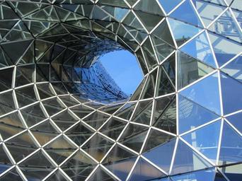 Keywords: architecture building abstract glass modern design business urban exterior steel blue background shape downtown square perspective new light geometric window tall front wall mirror shiny lines reflective futuristic