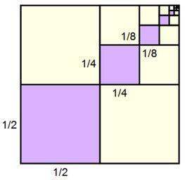 | Keywords: GeometricSquares.png An illustration of geometric series Each of the purple squares is 1/4 of the area of the previous square with the total area being <math>\frac 1 4 \ +\ \frac 1 16 \ +\ \frac 1 64 \ +\ \cdots \; \; \frac 1 3 </math> Self from data in Proofs without Words Exercises in Visual Thinking Classroom Resource Material by Roger B Nelson ISBN 978-0883857007 2007-08-08 en User Jim belk Jim belk GeometricSquares svg Original upload log from Wikipedia en 23 28 8 August 2007 359×350 6 KB Jim belk Talk contribs block The geometric series <nowiki><math>\frac 1 4 + \frac 1 16 + \frac 1 64 + \cdots</math></nowiki> sums to 1/3 Geometric series Quadrature of the Parabola Proof without words |