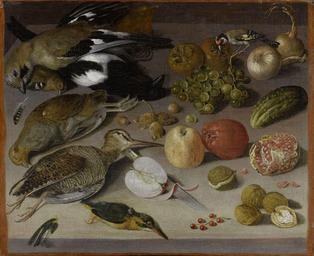 | Keywords: Georg Flegel Früchte- und Gemüsestilleben mit Vögeln.jpg Früchte- und Gemüsestilleben mit Vögeln oil canvas 48 x 56 5 cm http //www kollerauktionen ch/ Koller Auktionen by 1638 Creator Georg Flegel PD-old-100 17th-century still life paintings by Georg Flegel Still life paintings of fruits Still life paintings of vegetables Still-life paintings of dead birds Paintings of knives Redcurrants in art 17th-century still life paintings of fruits Location of museum or gallery missing 1630s still life paintings Images from Koller Auktionen Apples in art Grapes in art Hazelnuts in art Pomegranates in art Pickled cucumbers Onions in art Dead birds in art ImageNote 1 767 675 294 204 2000 1631 2 langswitch Haselnüsse Hazelnuts ImageNoteEnd 1 ImageNote 2 1535 1190 335 264 2000 1631 2 langswitch Walnüsse walnuts ImageNoteEnd 2 ImageNote 3 1638 588 283 161 2000 1631 2 Pickle ImageNoteEnd 3 ImageNote 4 1146 496 403 182 2000 1631 2 grapes ImageNoteEnd 4 ImageNote 5 1638 833 288 357 2000 1631 2 pomegranate ImageNoteEnd 5 ImageNote 6 773 1010 335 240 2000 1631 2 langswitch Apfel apple ImageNoteEnd 6 ImageNote 7 1127 787 324 259 2000 1631 2 langswitch Äpfel apples ImageNoteEnd 7 ImageNote 8 1176 1348 299 177 2000 1631 2 Maybe redcurrant ImageNoteEnd 8 ImageNote 9 1578 264 392 248 2000 1631 2 langswitch Zwiebeln onions ImageNoteEnd 9 ImageNote 10 1132 245 237 136 2000 1631 2 maybe kaki ImageNoteEnd 10 ImageNote 11 830 52 269 112 2000 1631 2 langswitch Birne pear ImageNoteEnd 11 |