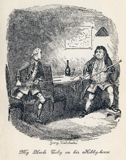 Keywords: George Cruikshank - Tristram Shandy, Plate V. My Uncle Toby on his Hobby-horse.png From George Cruikshank's illustrations to Laurence Sterne's Tristram Shandy Plate V My Uncle Toby on his Hobby-horse Hobby-horse in this case refers to a particular obsession of a person In this case Toby and Trim get caught up with discussions of the military to the point of acting it out Book IV Chapter XVIII The Life and Opinions of Tristram Shandy Gentleman and A Sentimental Journey Through France and Italy by Laurence Sterne With Illustrations by George Cruikshank London Hutchinson Co Paternoster Row 1906 This version published 1906 George Cruikshank 1792 “1878 PD-Old-100 Part of a series of illustrations of Tristram Shandy <gallery widths 200px heights 250px> File George Cruikshank - Tristram Shandy Plate I The Effects of Trim's Eloquence jpg Plate I The Effects of Trim's Eloquence<br/> PNG Scan File George Cruikshank - Tristram Shandy Plate II Obadiah leading in Dr Slop jpg Plate II Obadiah leading in Dr Slop<br/> PNG Scan File George Cruikshank - Tristram Shandy Plate III The Jack-boots transformed into Mortars jpg Plate III The Jack-boots transformed into Mortars<br/> PNG Scan File George Cruikshank - Tristram Shandy Plate IV The long-nosed Stranger of Strasburg jpg Plate IV The long-nosed Stranger of Strasburg<br/> PNG Scan File George Cruikshank - Tristram Shandy Plate V My Uncle Toby on his Hobby-horse jpg Plate V My Uncle Toby on his Hobby-horse<br /> PNG Scan File George Cruikshank - Tristram Shandy Plate VI Trim's relation of Tristram's misfortune jpg Plate VI Trim's relation of Tristram's misfortune<br/> PNG Scan File George Cruikshank - Tristram Shandy Plate VII The Quarrel of Slop and Susannah jpg Plate VII The Quarrel of Slop and Susannah<br/> PNG Scan File George Cruikshank - Tristram Shandy Plate VIII The Smoking Batteries jpg Plate VIII The Smoking Batteries<br/> PNG Scan </gallery> minor cleanup and levels adjustment George Cruikshank's illustrations of Tristram Shandy 1832 5 GCTS |