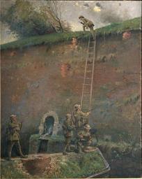 | Keywords: George Edmund Butler -The scaling of the walls of Le Quesnoy.jpg Artwork A woman looking at a roadside cemetery New Zealand troops ™ last major action of the First World War was the capture of Le Quesnoy in November 1918 a week before the armistice They scaled ladders set against the ancient walls of the old fortress town 1920 Oil on canvas Size mm 1532 1220 http //warart archives govt nz/node/176 object history credit line accession number NCWA 535 22498150 PD-old PD-NZ George Edmund Butler Citadelle du Quesnoy Battle of the Sambre 1918 War art at the Archives New Zealand |